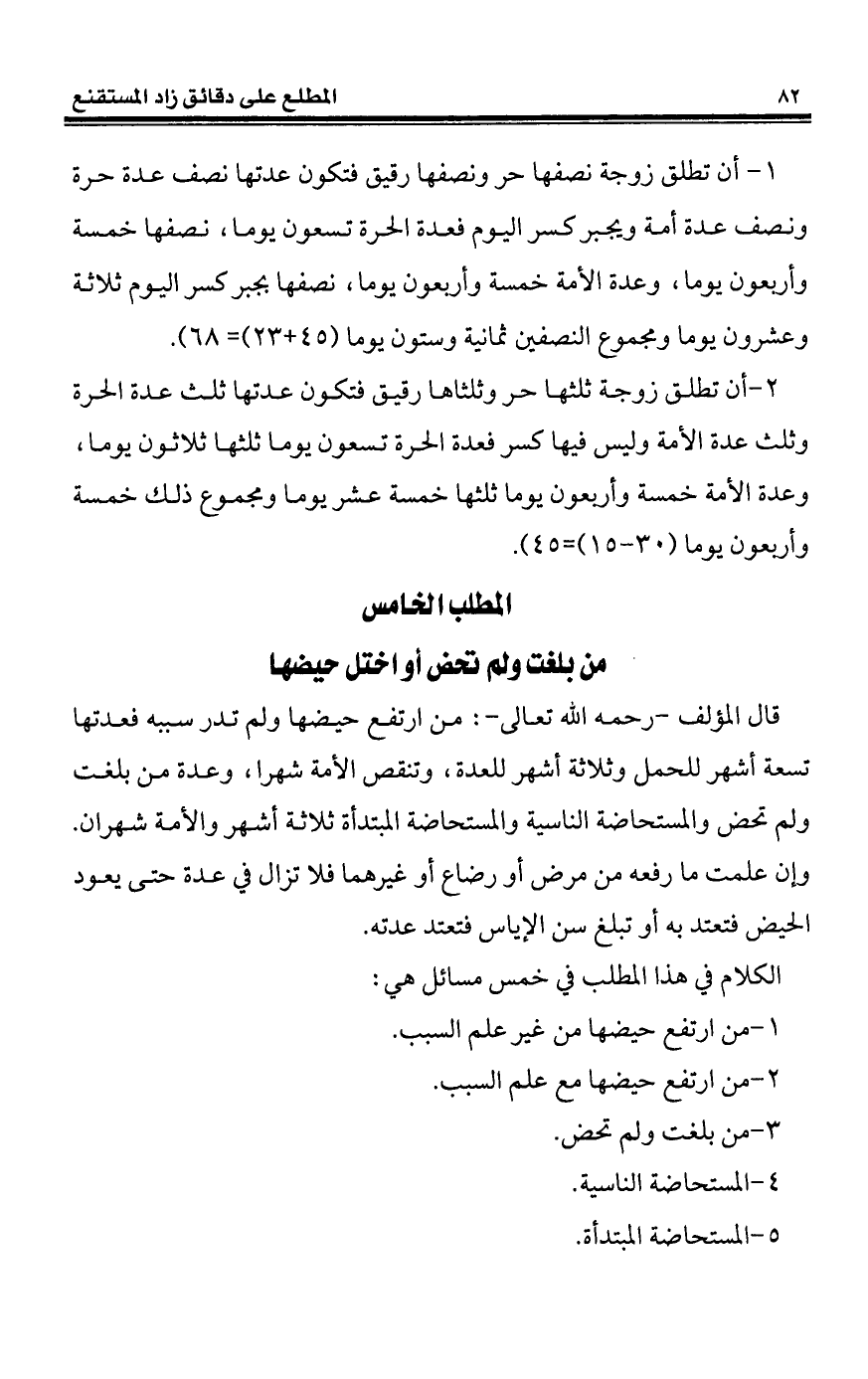 1 - أن تطلق زوجة نصفها حر ونصفها رقيق فتكون عدتها نصف عدة حرة ونصف عدة أمة ويجبر كسر اليوم فعدة الحرة تسعون يوما، نصفها خمسة وأربعون يوما، وعدة الأمة خمسة وأربعون يوما، نصفها يحبر كسر اليوم ثلاثة وعشرون يوما ومجموع النصفين ثمانية وستون يوما (45 + 23) = 68).