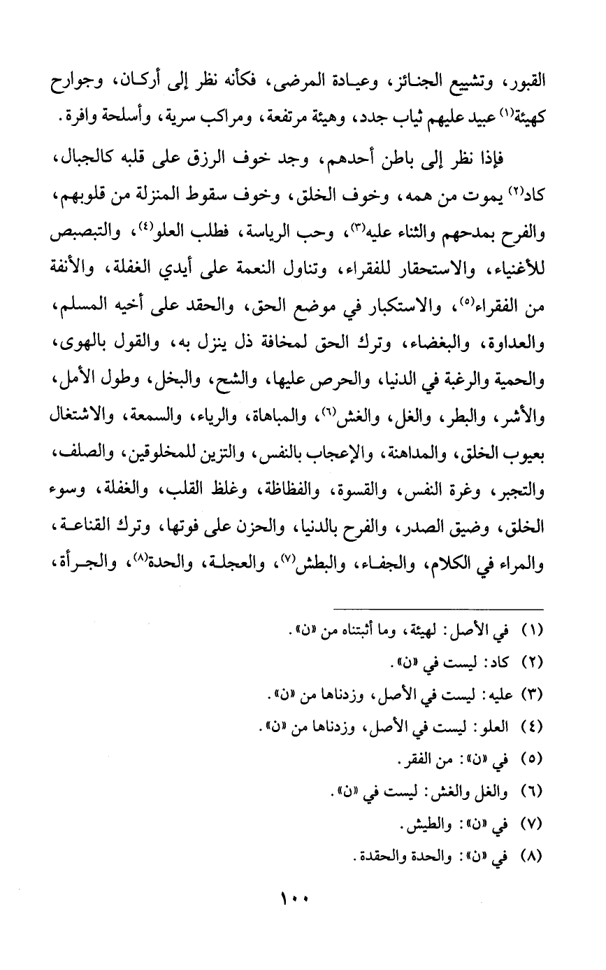 فإذا نظر إلى باطن أحدهم، وجد خوف الرزق على قلبه كالجبال، كاد يموت من همه، وخوف الخلق، وخوف سقوط المنزلة من قلوبهم، والفرح بمدحهم والثناء عليه، وحب الرياسة، فطلب العلو، والتبصبص للأغنياء، والاستحقار للفقراء، وتناول النعمة على أيدي الغفلة، والأنفة من الفقراء، والاستكبار في موضع الحق، والحقد على أخيه المسلم، والعداوة، والبغضاء، وترك الحق لمخافة ذل ينزل به، والقول بالهوى، والحمية والرغبة في الدنيا، والحرص عليها، والشح، والبخل، وطول الأمل، والأشر، والبطر، والغل، والغش، والمباهاة، والرياء، والسمعة، والاشتغال بعيوب الخلق، والمداهنة، والإعجاب بالنفس، والتزين للمخلوقين، والصلف، والتجبر، وغرة النفس، والقسوة، والفظاظة، وغلظ القلب، والغفلة، وسوء الخلق، وضيق الصدر، والفرح بالدنيا، والحزن على فوتها، وترك القناعة، والمراء في الكلام، والجفاء، والبطش، والعجلة، والحدة، والجرأة،
