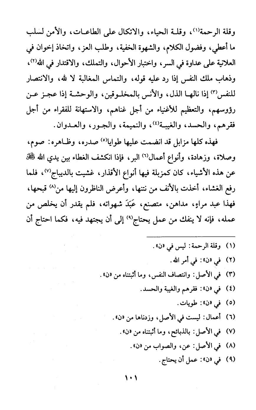 وقلة الرحمة، وقلة الحياء، والاتكال على الطاعات، والأمن لسلب ما أعطي، وفضول الكلام، والشهوة الخفية، وطلب العز، واتخاذ إخوان في العلانية على عداوة في السر، واختبار الأحوال، والتملك، والاقتدار في الله، وذهاب ملك النفس إذا رد عليه قوله، والتماس المغالبة لا لله، والانتصار للنفس، إذا نالها الذل، والأنس بالمخلوقين، والوحشة إذا عجز عن رؤوسهم، والتعظيم للأغنياء من أجل غناهم، والاستهانة للفقراء من أجل فقرهم، والحسد، والغيبة، والنميمة، والجور، والعدوان.