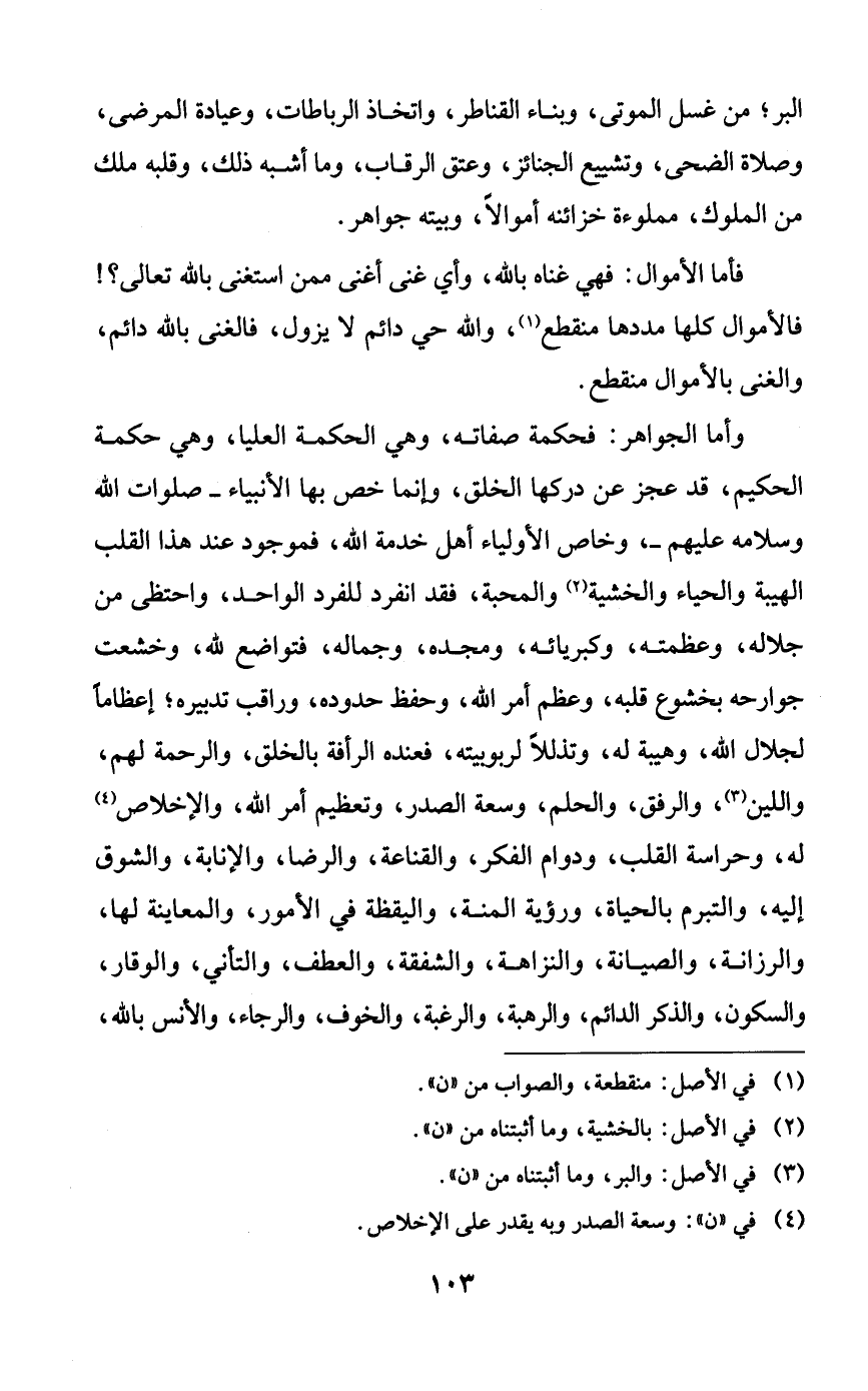 البر؛ من غسل الموتى، وبناء القناطر، واتخاذ الرباطات، وعيادة المرضى، وصلاة الضحى، وتشييع الجنائز، وعتق الرقاب، وما أشبه ذلك، وقلبه ملك من الملوك، مملوءة خزائنه أموالاً، وبيته جواهر.