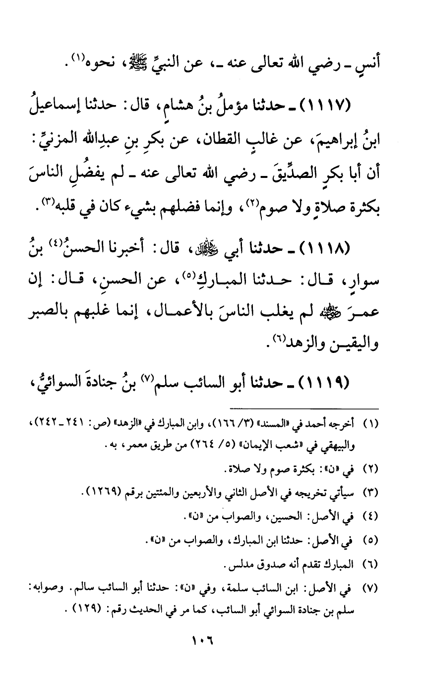 1117 - حدثنا مؤمل بن هشامٍ، قال: حدثنا إسماعيل ابن إبراهيم، عن غالبٍ القطان، عن بكر بن عبد الله المزني: أن أبا بكرٍ الصديق -رضي الله تعالى عنه- لم يفضل الناس بكثرة صلاةٍ ولا صوم، وإنما فضلهم بشيء كان في قلبه.