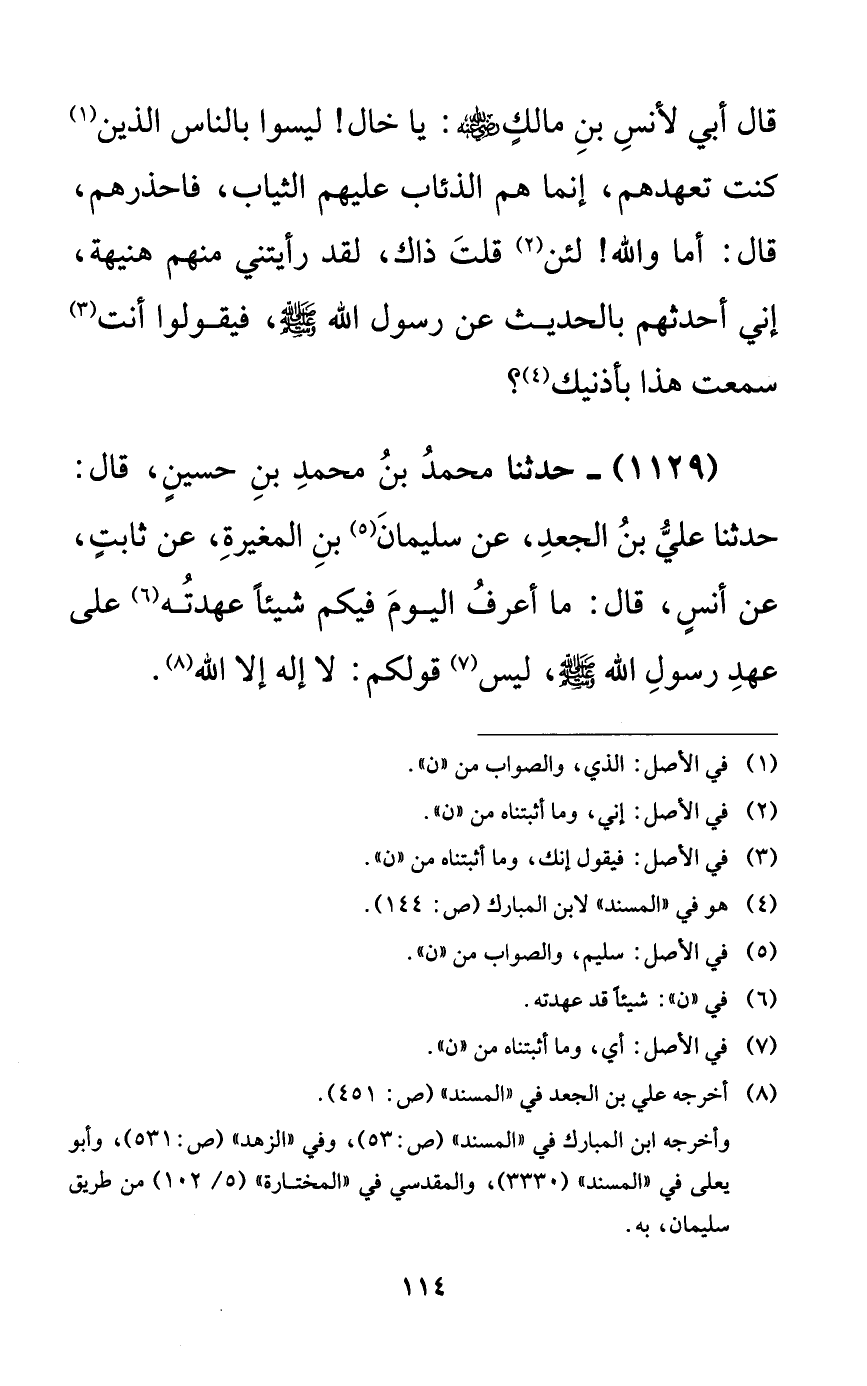 1129 - حدثنا محمد بن محمد بن حسينٍ، قال: حدثنا علي بن الجعد، عن سليمان بن المغيرة، عن ثابتٍ، عن أنسٍ، قال: ما أعرف اليوم فيكم شيئاً عهدته على عهد رسول الله صلى الله عليه وسلم، ليس قولكم: لا إله إلا الله.