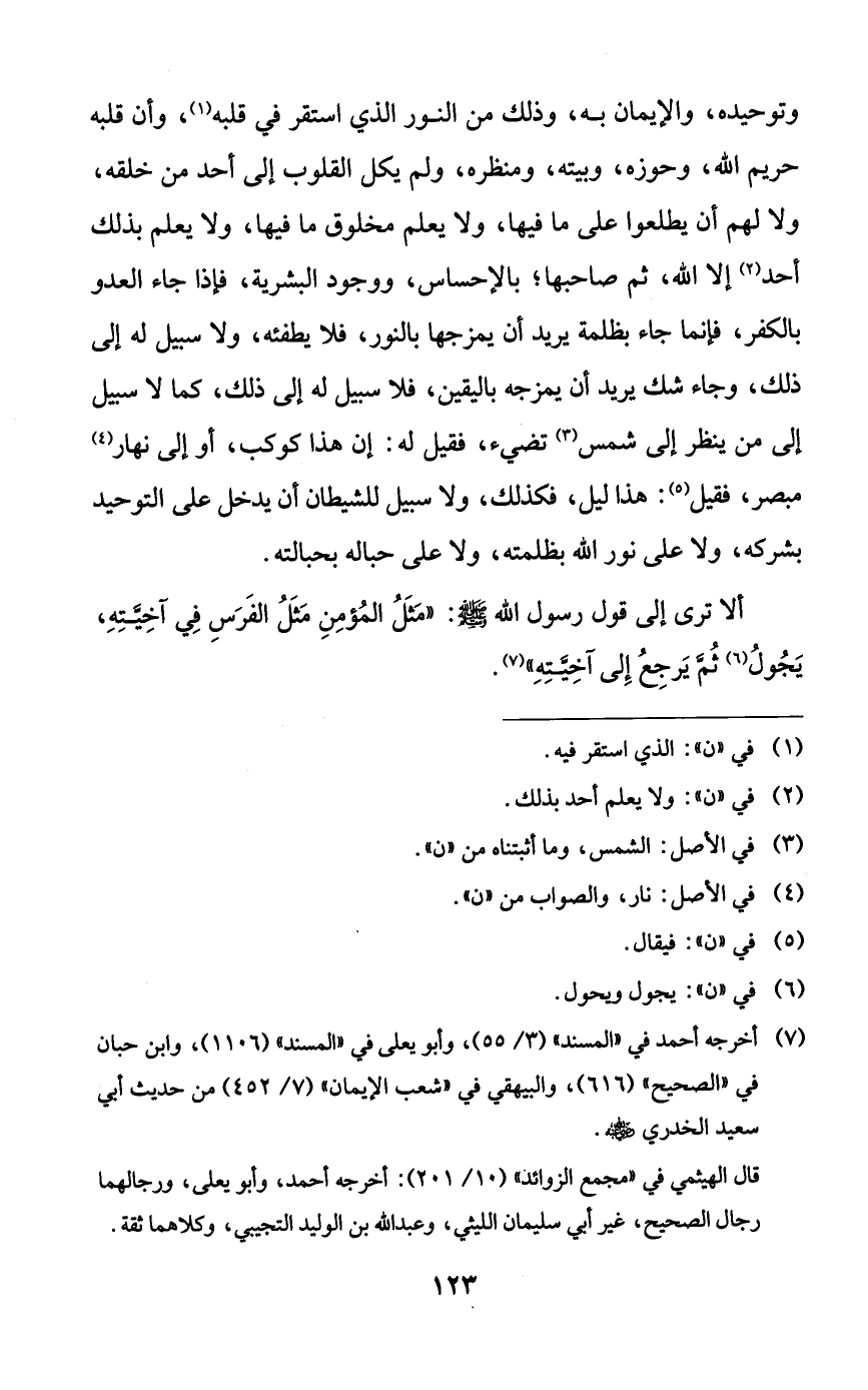 وتوحيده، والإيمان به، وذلك من النور الذي استقر في قلبه، وأن قلبه حريم الله، وحوزه، وبيته، ومنظره، ولم يكل القلوب إلى أحد من خلقه، ولا لهم أن يطلعوا على ما فيها، ولا يعلم مخلوق ما فيها، ولا يعلم بذلك أحد إلا الله، ثم صاحبها؛ بالإحساس، ووجود البشرية، فإذا جاء العدو بالكفر، فإنما جاء بظلمة يريد أن يمزجها بالنور، فلا يطفئه، ولا سبيل له إلى ذلك، وجاء شك يريد أن يمزجه باليقين، فلا سبيل له إلى ذلك، كما لا سبيل إلى من ينظر إلى شمس تضيء، فقيل له: إن هذا كوكب، أو إلى نهار مبصر، فقيل: هذا ليل، فكذلك، ولا سبيل للشيطان أن يدخل على التوحيد بشركه، ولا على نور الله بظلمته، ولا على حباله بحبالته.