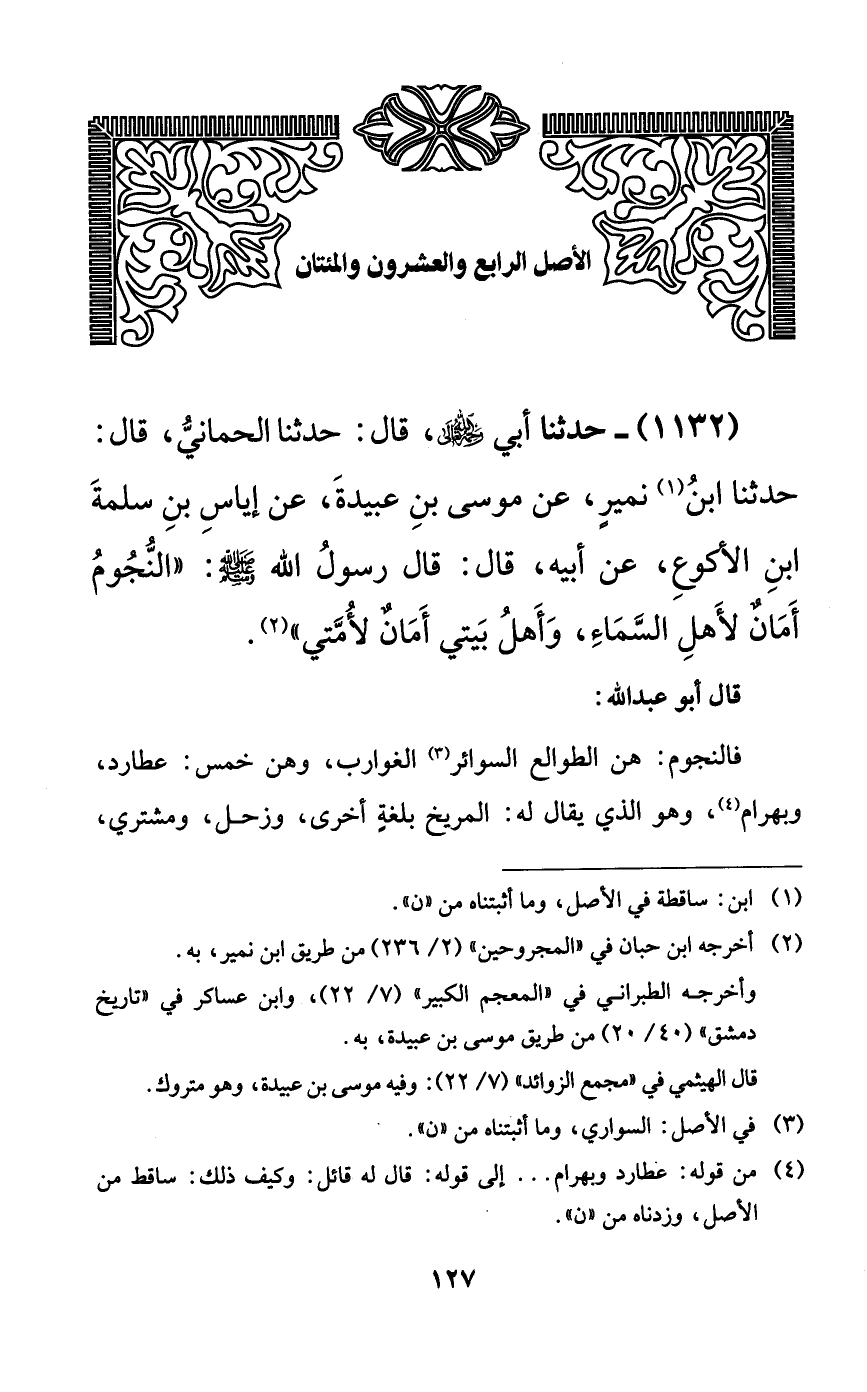 1132 - حدثنا أبي رحمه الله تعالى، قال: حدثنا الحماني، قال: حدثنا ابن نميرٍ، عن موسى بن عبيدة، عن إياس بن سلمة ابن الأكوع، عن أبيه، قال: قال رسول الله صلى الله عليه وسلم: ((النجوم أمانٌ لأهل السماء، وأهل بيتي أمانٌ لأمتي)).