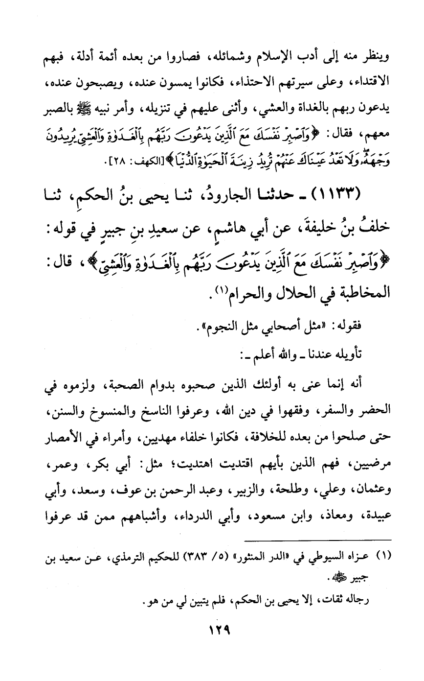 1133 - حدثنا الجارود، ثنا يحيى بن الحكم، ثنا خلف بن خليفة، عن أبي هاشمٍ، عن سعيد بن جبيرٍ في قوله: {واصبر نفسك مع الذين يدعون ربهم بالغداة والعشي}، قال: المخاطبة في الحلال والحرام.