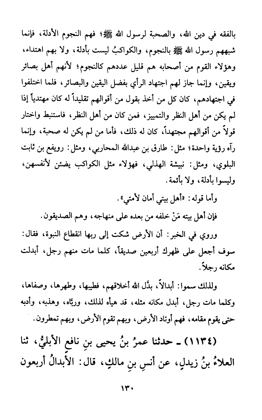 بالفقه في دين الله، والصحبة لرسول الله صلى الله عليه وسلم؛ فهم النجوم الأدلة، فإنما شبههم رسول الله صلى الله عليه وسلم بالنجوم، والكواكب ليست بأدلة، ولا بهم اهتداء، وهؤلاء القوم من أصحابه هم قليل عددهم كالنجوم، لأنهم أهل بصائر ويقين، وإنما جاز لهم اجتهاد الرأي بفضل اليقين والبصائر، فلما اختلفوا في اجتهادهم، كان كل من أخذ بقول من أقوالهم تقليداً له، كان مهتدياً إذا لم يكن من أهل النظر والتمييز، فمن كان من أهل النظر، فاستنبط واختار قولاً من أقوالهم مجتهداً، كان له ذلك، فأما من لم يكن له صحبة، وإنما رآه رؤية واحدة؛ مثل: طارق بن عبد الله المحاربي، ومثل: رويفع بن ثابت البلوي، ومثل: نبيشة الهذلي، فهؤلاء مثل الكواكب يضئن لأنفسهن، وليسوا بأدلة، ولا بأئمة.