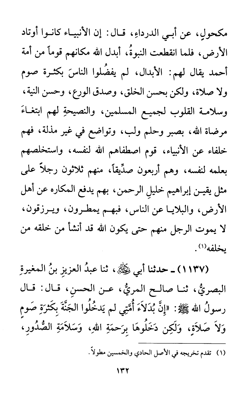 1137 - حدثنا أبي رحمه الله، ثنا عبد العزيز بن المغيرة البصري، ثنا صالح المري، عن الحسن، قال: قال رسول الله صلى الله عليه وسلم: ((إن بدلاء أمتي لم يدخلوا الجنة بكثرة صومٍ ولا صلاةٍ، ولكن دخلوها برحمة الله، وسلامة الصدور،