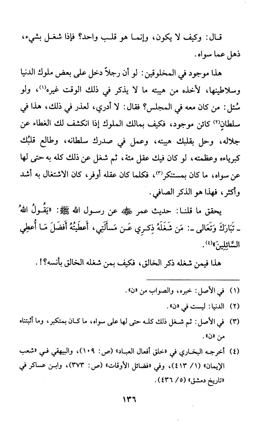 هذا موجود في المخلوقين: لو أن رجلاً دخل على بعض ملوك الدنيا وسلاطينها، لأخذه من هيبته ما لا يذكر في ذلك الوقت غيره، ولو سئل: من كان معه في المجلس؟ فقال: لا أدري، لعذر في ذلك، هذا في سلطانٍ كائن موجود، فكيف بمالك الملوك إذا انكشف لك الغطاء عن جلاله، وحل بقلبك هيبته، وعمل في صدرك سلطانه، وطالع قلبك كبرياءه وعظمته، لو كان فيك عقل مئة، ثم شغل عن ذلك كله به حتى لها عن سواه، ما كان بمستنكر، فكلما كان عقله أوفر، كان الاشتغال به أشد وأكثر، فهذا هو الذكر الصافي.