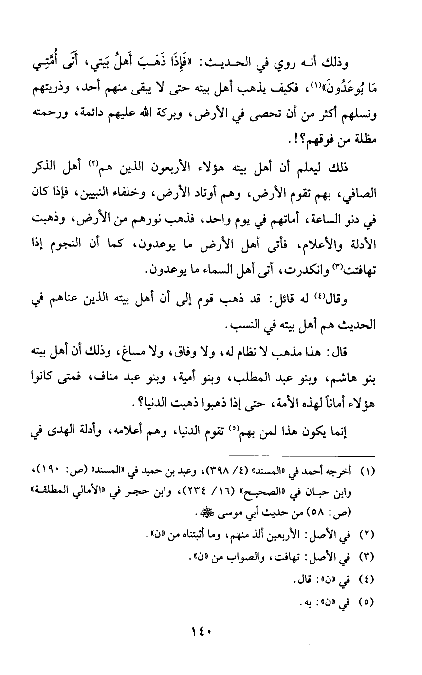 قال: هذا مذهب لا نظام له، ولا وفاق، ولا مساغ، وذلك أن أهل بيته بنو هاشم، وبنو عبد المطلب، وبنو أمية، وبنو عبد مناف، فمتى كانوا هؤلاء أماناً لهذه الأمة، حتى إذا ذهبوا ذهبت الدنيا؟