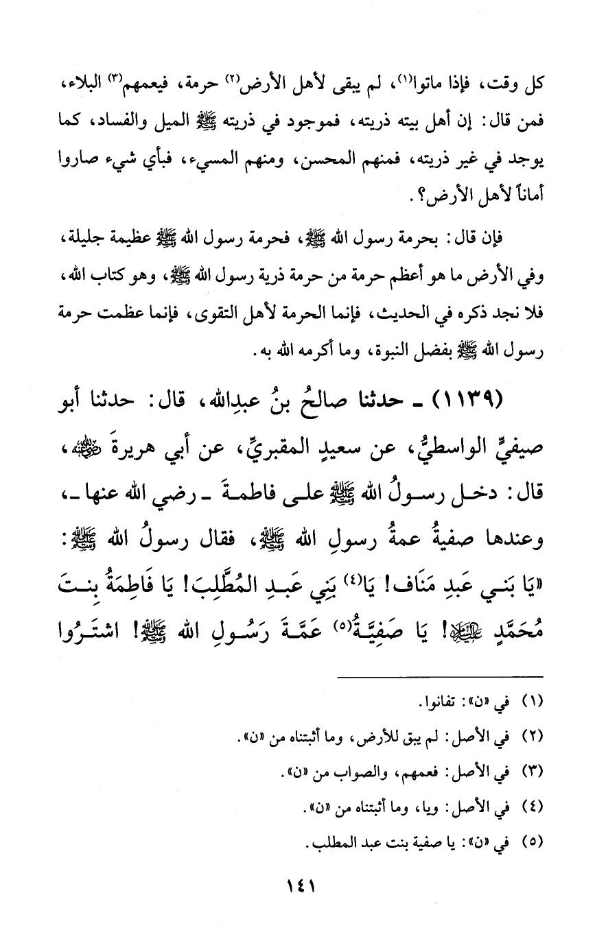 1139 - حدثنا صالح بن عبد الله، قال: حدثنا أبو صيفي الواسطي، عن سعيدٍ المقبري، عن أبي هريرة رضي الله عنه، قال: دخل رسول الله صلى الله عليه وسلم على فاطمة -رضي الله عنها-، وعندها صفية عمة رسول الله صلى الله عليه وسلم، فقال رسول الله صلى الله عليه وسلم: ((يا بني عبد مناف! يا بني عبد المطلب! يا فاطمة بنت محمدٍ عليه السلام! يا صفية عمة رسول الله صلى الله عليه وسلم! اشتروا