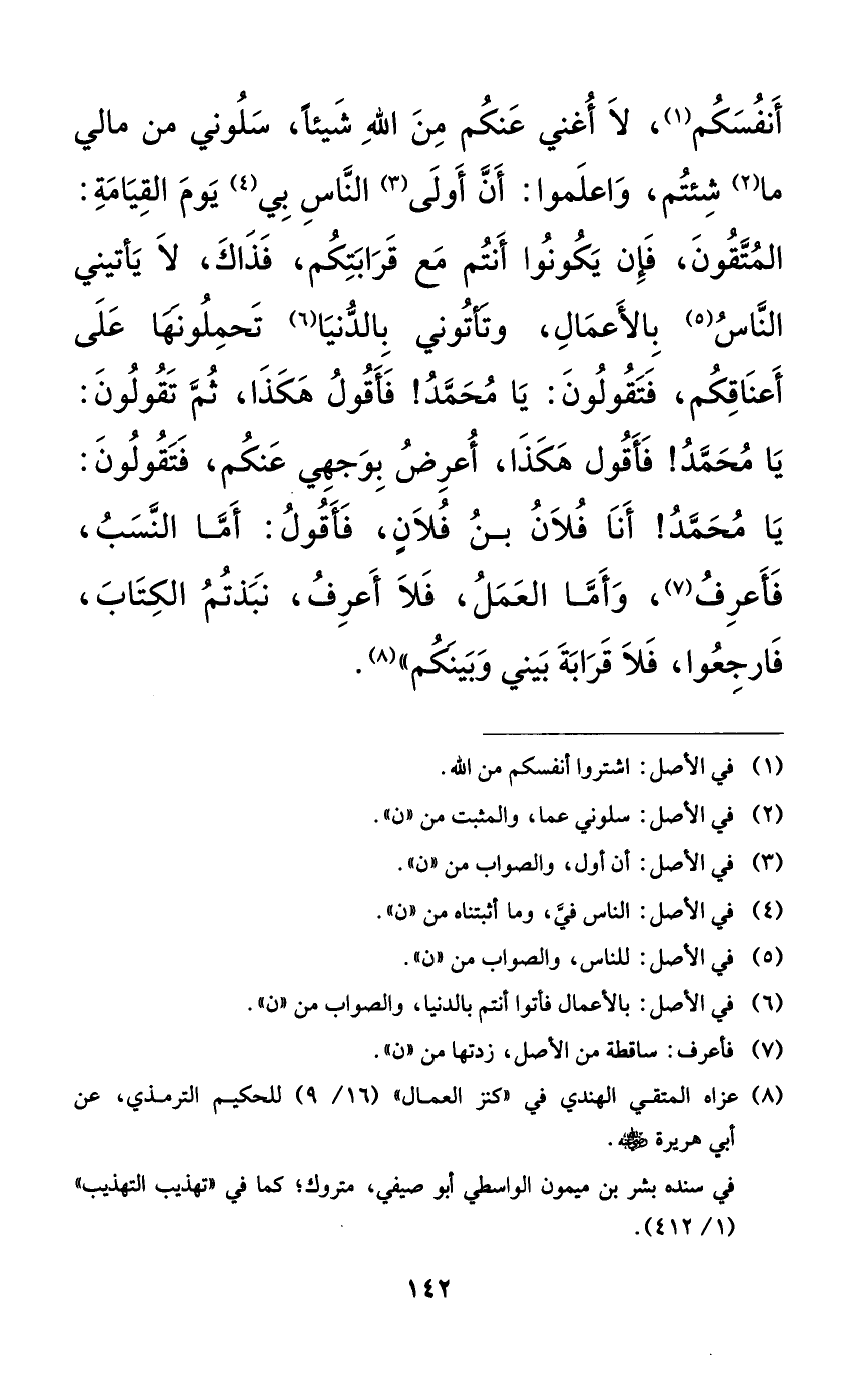 أنفسكم، لا أغني عنكم من الله شيئاً، سلوني من مالي ما شئتم، واعلموا: أن أولى الناس بي يوم القيامة: المتقون، فإن يكونوا أنتم مع قرابتكم، فذاك، لا يأتيني الناس بالأعمال، وتأتوني بالدنيا تحملونها على أعناقكم، فتقولون: يا محمد! فأقول هكذا، ثم تقولون: يا محمد! فأقول هكذا، أعرض بوجهي عنكم، فتقولون: يا محمد! أنا فلان بن فلانٍ، فأقول: أما النسب، فأعرف، وأما العمل، فلا أعرف، نبذتم الكتاب، فارجعوا، فلا قرابة بيني وبينكم)).