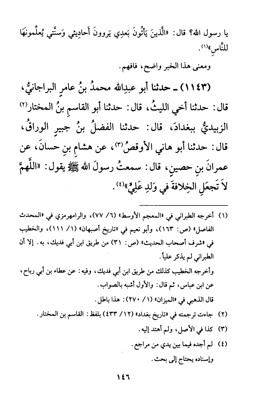 1143 - حدثنا أبو عبد الله محمد بن عامرٍ البراجاني، قال: حدثنا أخي الليث، قال: حدثنا أبو القاسم بن المختار الزبيدي ببغداد، قال: حدثنا الفضل بن جبيرٍ الوراق، قال: حدثنا أبو هاني الأوقص، عن هشام بن حسان، عن عمران بن حصينٍ، قال: سمعت رسول الله صلى الله عليه وسلم يقول: ((اللهم لا تجعل الخلافة في ولد عليٍّ)).