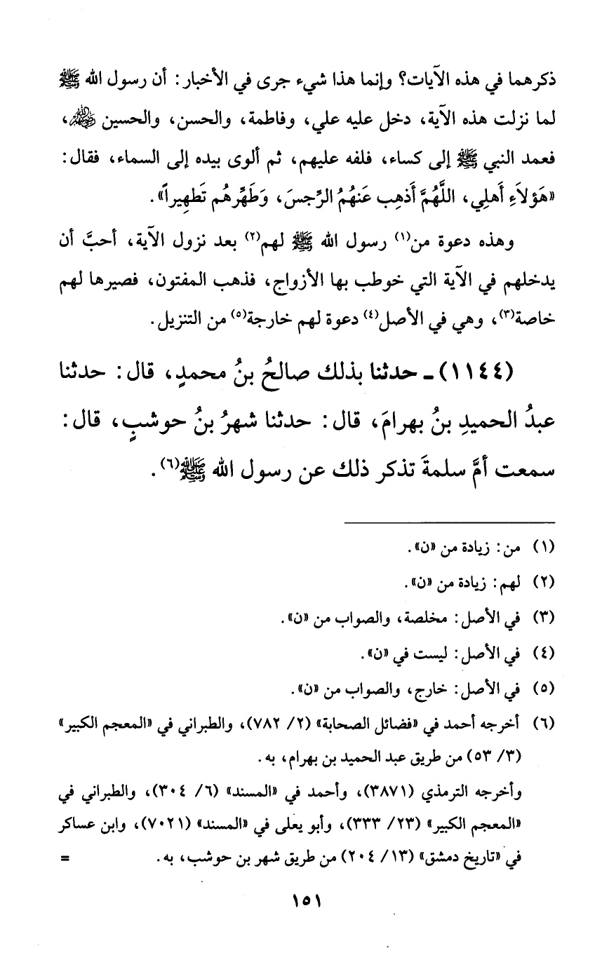 1144 - حدثنا بذلك صالح بن محمدٍ، قال: حدثنا عبد الحميد بن بهرام، قال: حدثنا شهر بن حوشبٍ، قال: سمعت أم سلمة تذكر ذلك عن رسول الله صلى الله عليه وسلم.