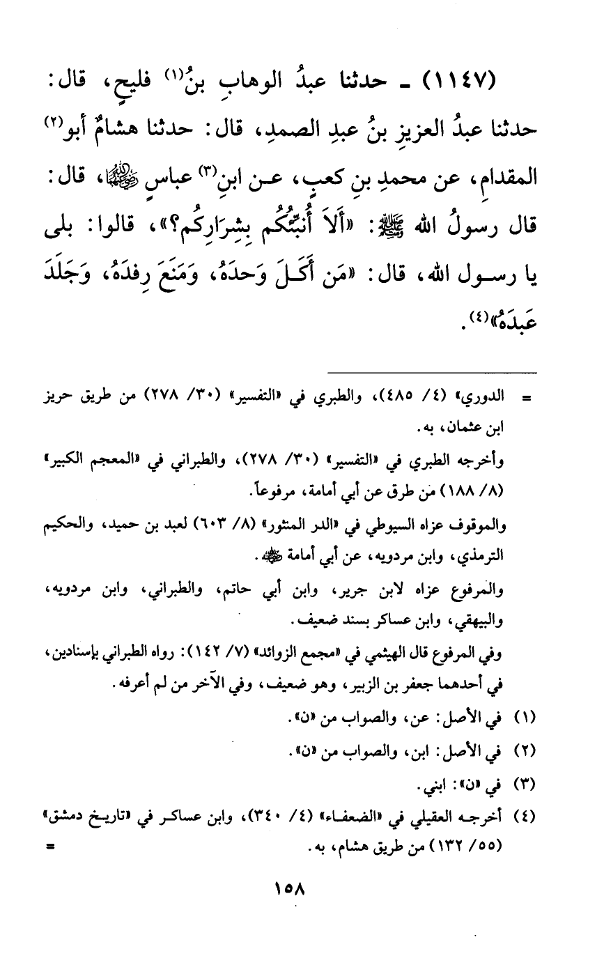 1147 - حدثنا عبد الوهاب بن فليحٍ، قال: حدثنا عبد العزيز بن عبد الصمد، قال: حدثنا هشامٌ أبو المقدام، عن محمد بن كعبٍ، عن ابن عباسٍ رضي الله عنهما، قال: قال رسول الله صلى الله عليه وسلم: ((ألا أنبئكم بشراركم؟))، قالوا: بلى يا رسول الله، قال: ((من أكل وحده، ومنع رفده، وجلد عبده)).