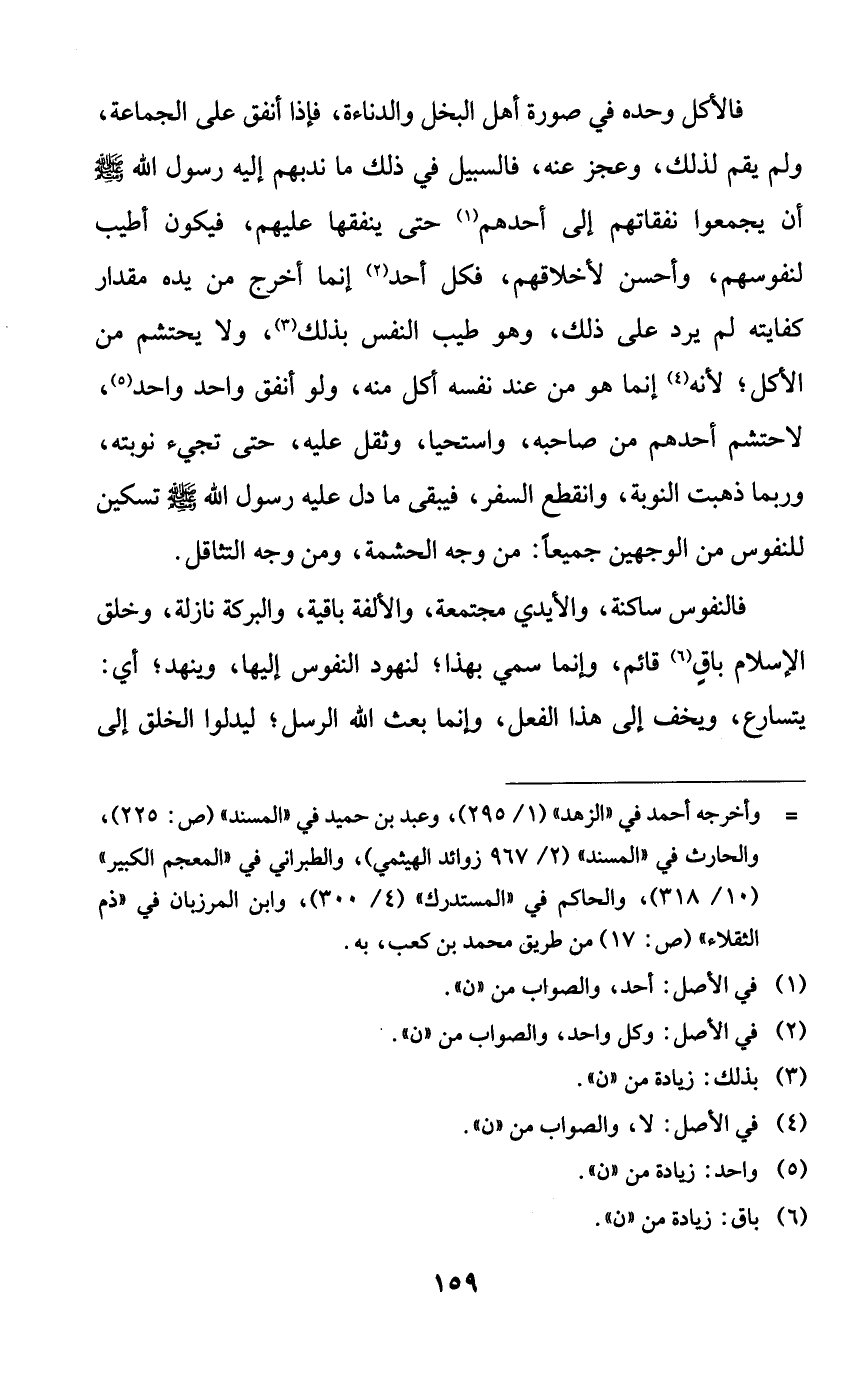 فالأكل وحده في صورة أهل البخل والدناءة، فإذا أنفق على الجماعة، ولم يقم لذلك، وعجز عنه، فالسبيل في ذلك ما ندبهم إليه رسول الله صلى الله عليه وسلم أن يجمعوا نفقاتهم إلى أحدهم حتى ينفقها عليهم، فيكون أطيب لنفوسهم، وأحسن لأخلاقهم، فكل أحد إنما أخرج من يده مقدار كفايته لم يرد على ذلك، وهو طيب النفس بذلك، ولا يحتشم من الأكل؛ لأنه إنما هو من عند نفسه أكل منه، ولو أنفق واحد واحد، لاحتشم أحدهم من صاحبه، واستحيا، وثقل عليه، حتى تجيء نوبته، وربما ذهبت النوبة، وانقطع السفر، فيبقى ما دل عليه رسول الله صلى الله عليه وسلم تسكين للنفوس من الوجهين جميعاً: من وجه الحشمة، ومن وجه التثاقل.
