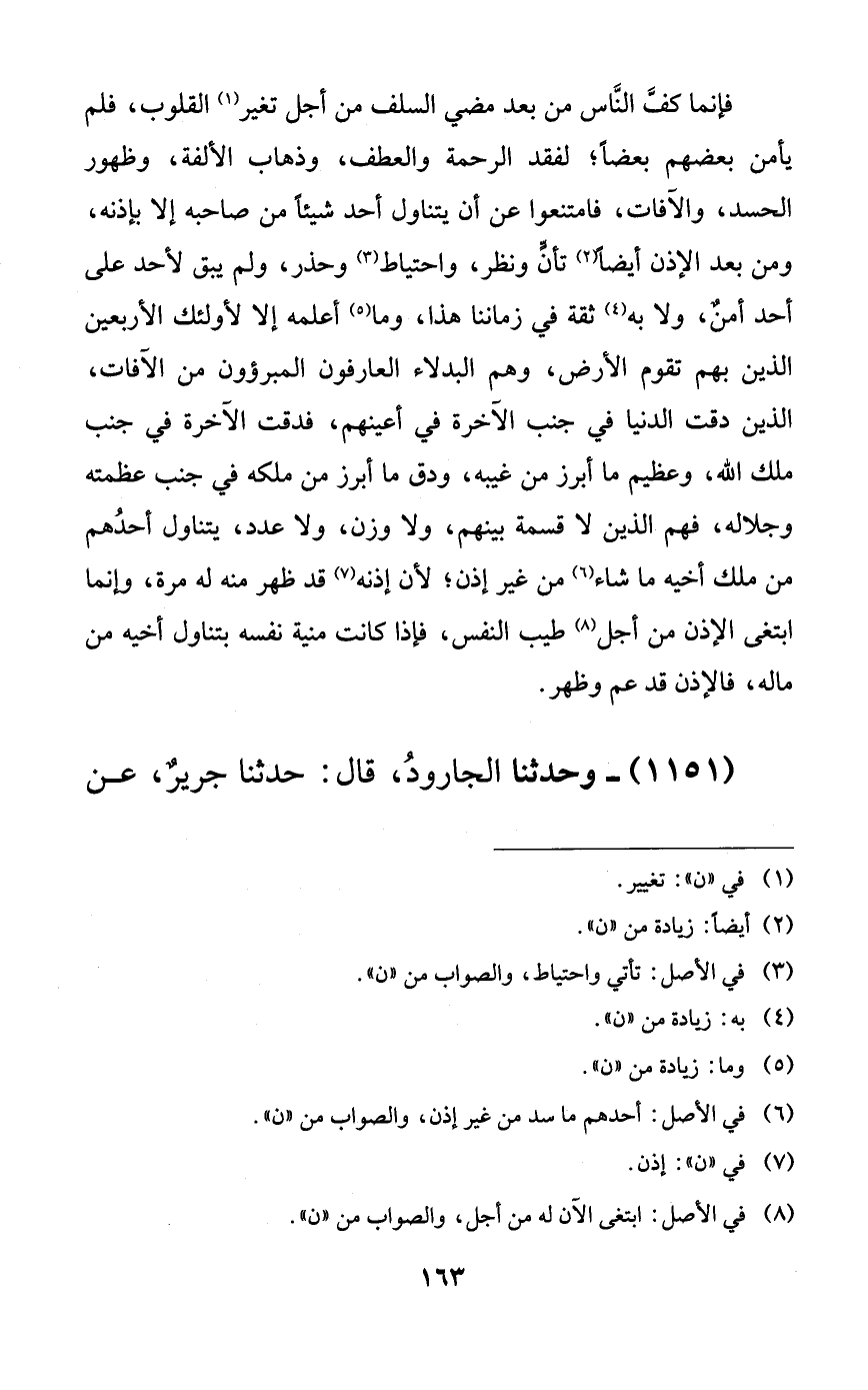 فإنما كف الناس من بعد مضي السلف من أجل تغير القلوب، فلم يأمن بعضهم بعضاً؛ لفقد الرحمة والعطف، وذهاب الألفة، وظهور الحسد، والآفات، فامتنعوا عن أن يتناول أحد شيئًا من صاحبه إلا بإذنه، ومن بعد الإذن أيضاً تأن ونظر، واحتياط وحذر، ولم يبق لأحد على أحد أمنٌ، ولا به ثقة في زماننا هذا، وما أعلمه إلا لأولئك الأربعين الذين بهم تقوم الأرض، وهم البدلاء العارفون المبرؤون من الآفات، الذين دقت الدنيا في جنب الآخرة في أعينهم، فدقت الآخرة في جنب ملك الله، وعظيم ما أبرز من غيبه، ودق ما أبرز من ملكه في جنب عظمته وجلاله، فهم الذين لا قسمة بينهم، ولا وزن، ولا عدد، يتناول أحدهم من ملك أخيه ما شاء من غير إذن؛ لأن إذنه قد ظهر منه له مرة، وإنما ابتغى الإذن من أجل طيب النفس، فإذا كانت منية نفسه بتناول أخيه من ماله، فالإذن قد عم وظهر.