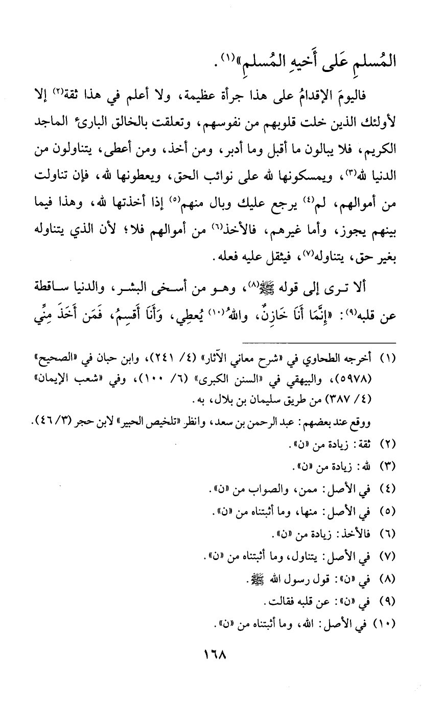 فاليوم الإقدام على هذا جرأة عظيمة، ولا أعلم في هذا ثقة إلا لأولئك الذين خلت قلوبهم من نفوسهم، وتعلقت بالخالق البارئ الماجد الكريم، فلا يبالون ما أقبل وما أدبر، ومن أخذ، ومن أعطى، يتناولون من الدنيا لله، ويمسكونها لله على نوائب الحق، ويعطونها لله، فإن تناولت من أموالهم، لم يرجع عليك وبال منهم إذا أخذتها لله، وهذا فيما بينهم يجوز، وأما غيرهم، فالأخذ من أموالهم فلا؛ لأن الذي يتناوله بغير حق، يتناوله، فيثقل عليه فعله.