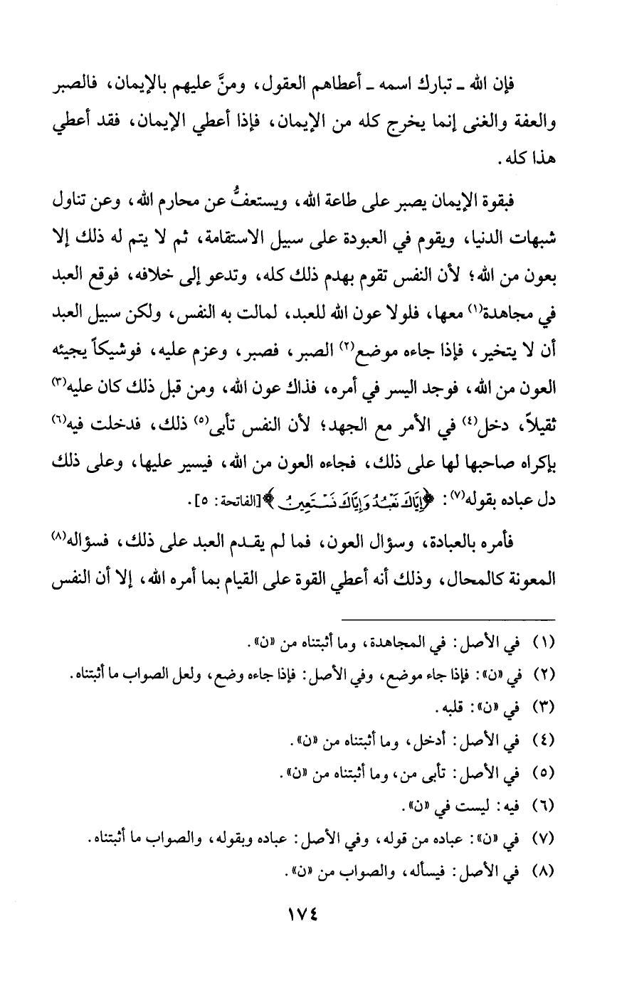 فبقوة الإيمان يصبر على طاعة الله، ويستعف عن محارم الله، وعن تناول شبهات الدنيا، ويقوم في العبودة على سبيل الاستقامة، ثم لا يتم له ذلك إلا بعون من الله؛ لأن النفس تقوم بهدم ذلك كله، وتدعو إلى خلافه، فوقع العبد في مجاهدة معها، فلولا عون الله للعبد، لمالت به النفس، ولكن سبيل العبد أن لا يتخير، فإذا جاءه موضع الصبر، فصبر، وعزم عليه، فوشيكاً يجيئه العون من الله، فوجد اليسر في أمره، فذاك عون الله، ومن قبل ذلك كان عليه ثقيلاً، دخل في الأمر مع الجهد؛ لأن النفس تأبى ذلك، فدخلت فيه بإكراه صاحبها لها على ذلك، فجاءه العون من الله، فيسير عليها، وعلى ذلك دل عباده بقوله: {إياك نعبد وإياك نستعين}.