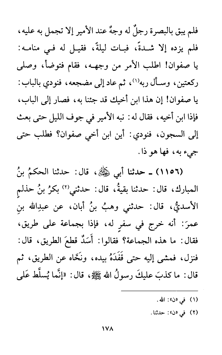 1156 - حدثنا أبي رحمه الله، قال: حدثنا الحكم بن المبارك، قال: حدثنا بقية، قال: حدثني بكر بن حذلمٍ الأسدي، قال: حدثني وهب بن أبان، عن عبد الله بن عمر: أنه خرج في سفرٍ له، فإذا بجماعة على طريق، فقال: ما هذه الجماعة؟ فقالوا: أسدٌ قطع الطريق، قال: فنزل، فمشى إليه حتى قفده بيده، ونحاه عن الطريق، ثم قال: ما كذب عليك رسول الله صلى الله عليه وسلم، قال: ((إنما يسلط على