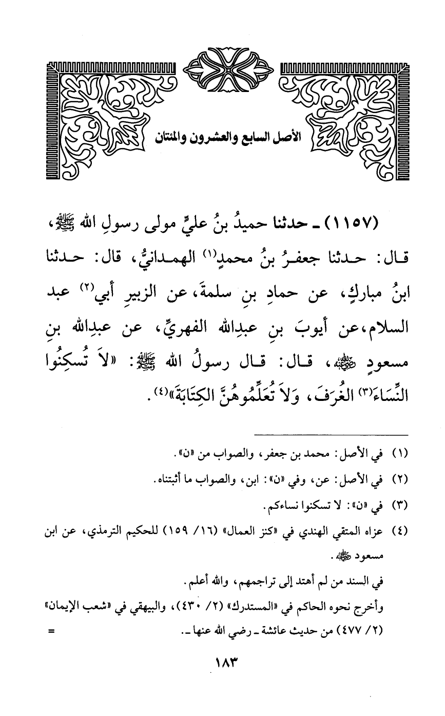 1157 - حدثنا حميد بن عليٍّ مولى رسول الله صلى الله عليه وسلم، قال: حدثنا جعفر بن محمدٍ الهمداني، قال: حدثنا ابن مباركٍ، عن حماد بن سلمة، عن الزبير أبي عبد السلام، عن أيوب بن عبد الله الفهري، عن عبد الله بن مسعودٍ رضي الله عنه، قال: قال رسول الله صلى الله عليه وسلم: ((لا تسكنوا النساء الغرف، ولا تعلموهن الكتابة)).