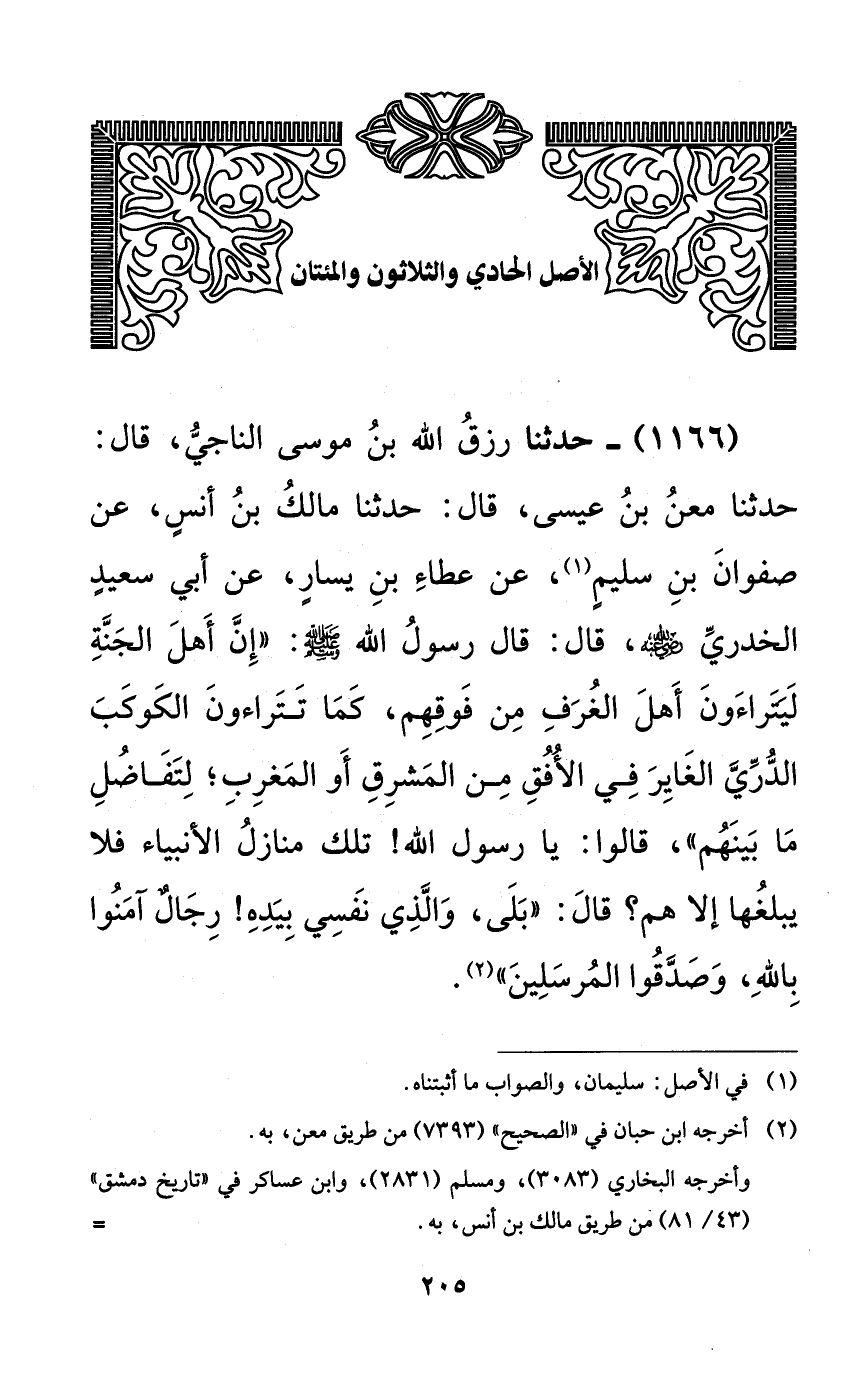 1166 - حدثنا رزق الله بن موسى الناجي، قال: حدثنا معن بن عيسى، قال: حدثنا مالك بن أنسٍ، عن صفوان بن سليمٍ، عن عطاء بن يسارٍ، عن أبي سعيدٍ الخدري رضي الله عنه، قال: قال رسول الله صلى الله عليه وسلم: ((إن أهل الجنة ليتراءون أهل الغرف من فوقهم، كما تتراءون الكوكب الدري الغابر في الأفق من المشرق أو المغرب؛ لتفاضل ما بينهم))، قالوا: يا رسول الله! تلك منازل الأنبياء فلا يبلغها إلا هم؟ قال: ((بلى، والذي نفسي بيده! رجالٌ آمنوا بالله، وصدقوا المرسلين)).
