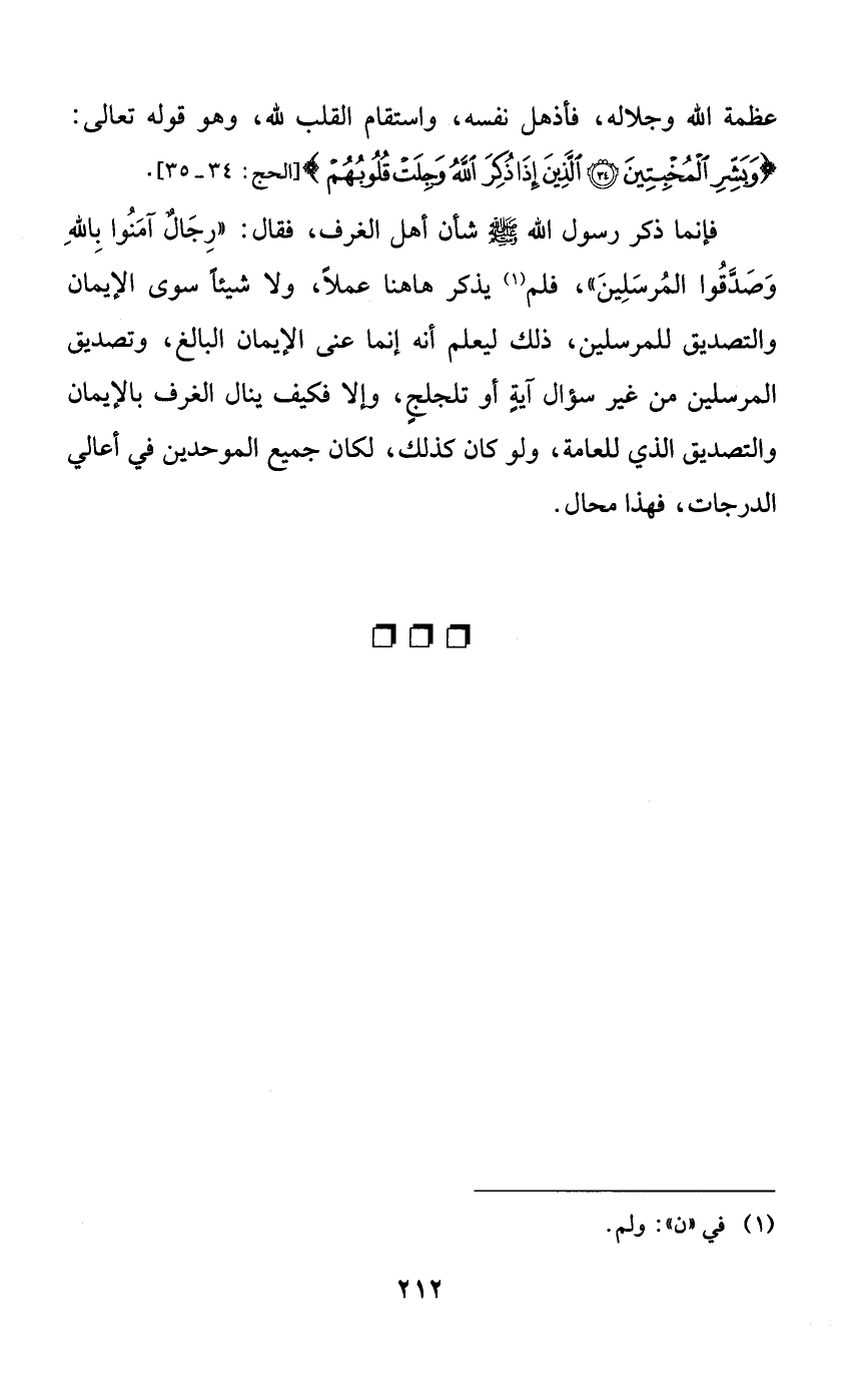 فإنما ذكر رسول الله صلى الله عليه وسلم شأن أهل الغرف، فقال: ((رجالٌ آمنوا بالله وصدقوا المرسلين))، فلم يذكر هاهنا عملاً، ولا شيئاً سوى الإيمان والتصديق للمرسلين، ذلك ليعلم أنه إنما عنى الإيمان البالغ، وتصديق المرسلين من غير سؤال آيةٍ أو تلجلجٍ، وإلا فكيف ينال الغرف بالإيمان والتصديق الذي للعامة، ولو كان كذلك، لكان جميع الموحدين في أعالي الدرجات، فهذا محال.