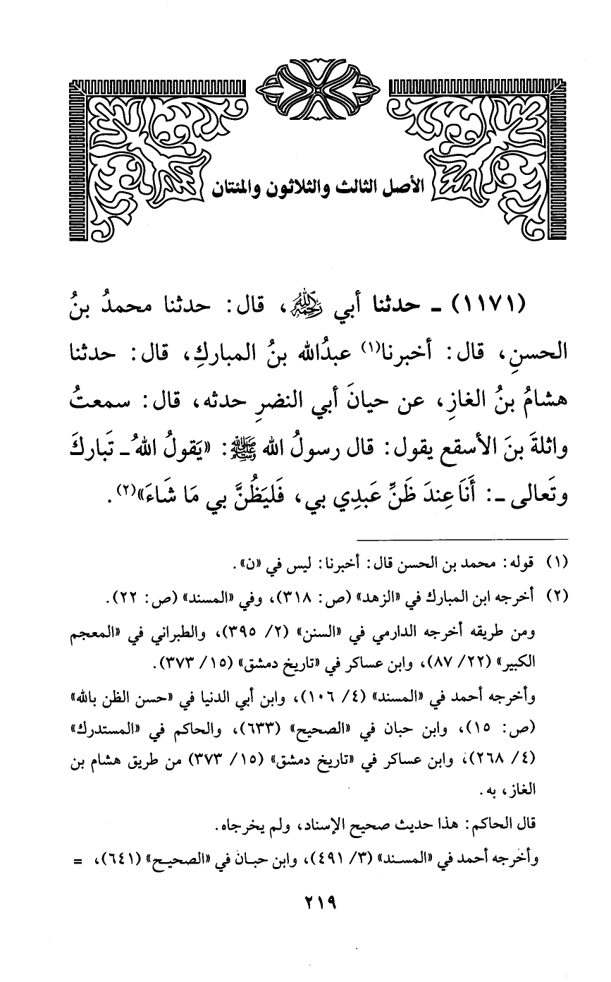 1171 - حدثنا أبي رحمه الله، قال: حدثنا محمد بن الحسن، قال: أخبرنا عبد الله بن المبارك، قال: حدثنا هشام بن الغاز، عن حيان أبي النضر حدثه، قال: سمعت واثلة بن الأسقع يقول: قال رسول الله صلى الله عليه وسلم: ((يقول الله -تبارك وتعالى-: أنا عند ظن عبدي بي، فليظن بي ما شاء)).