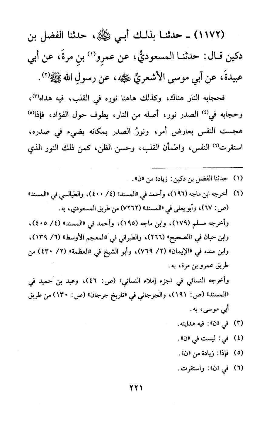 1172 - حدثنا بذلك أبي رحمه الله، حدثنا الفضل بن دكين قال: حدثنا المسعودي، عن عمرو بن مرة، عن أبي عبيدة، عن أبي موسى الأشعري رضي الله عنه، عن رسول الله صلى الله عليه وسلم.