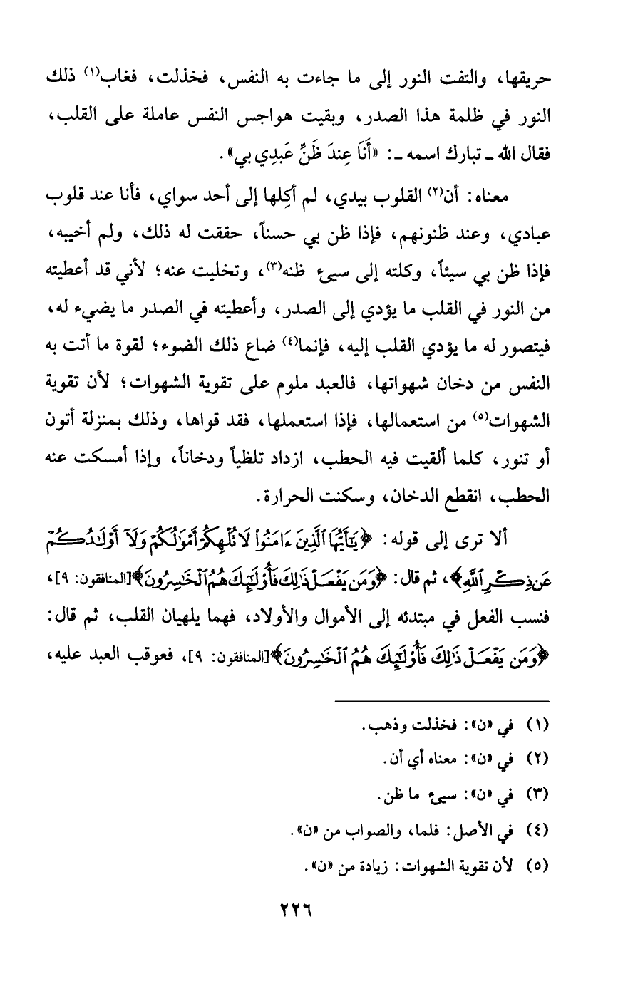 حريقها، والتفت النور إلى ما جاءت به النفس، فخذلت فغاب ذلك النور في ظلمة هذا الصدر، وبقيت هواجس النفس عاملة على القلب، فقال الله -تبارك اسمه-: ((أنا عند ظن عبدي بي)).
