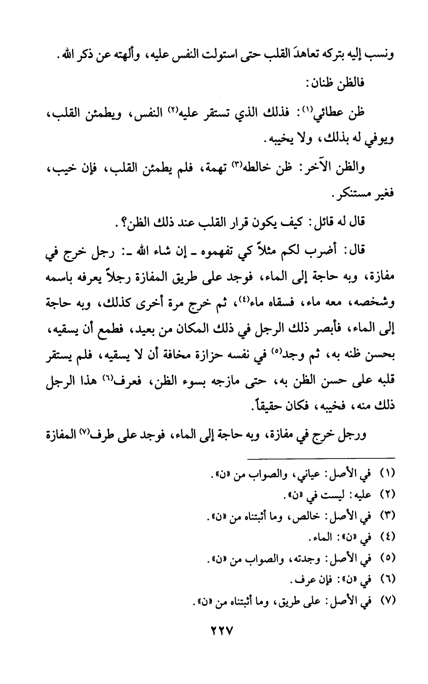 قال: أضرب لكم مثلاً كي تفهموه -إن شاء الله-: رجل خرج في مفازة، وبه حاجة إلى الماء، فوجد على طريق المفازة رجلاً يعرفه باسمه وشخصه، معه ماء، فسقاه ماء، ثم خرج مرة أخرى كذلك، وبه حاجة إلى الماء، فأبصر ذلك الرجل في ذلك المكان من بعيد، فطمع أن يسقيه، بحسن ظنه به، ثم وجد في نفسه حزازة مخافة أن لا يسقيه، فلم يستقر قلبه على حسن الظن به، حتى مازجه بسوء الظن، فعرف هذا الرجل ذلك منه، فخيبه، فكان حقيقاً.
