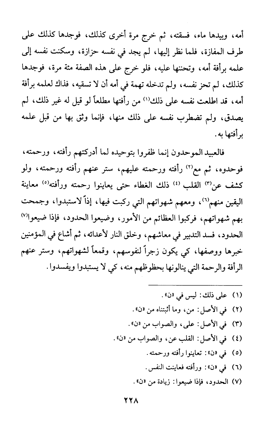 فالعبيد الموحدون إنما ظفروا بتوحيده لما أدركتهم رأفته، ورحمته، فوحدوه، ثم مع رأفته ورحمته عليهم، ستر عنهم رأفته ورحمته، ولو كشف عن القلب ذلك الغطاء حتى يعاينوا رحمته ورأفته معاينة اليقين منهم، ومعهم شهواتهم التي ركبت فيها، إذاً لاستبدوا، وجمحت بهم شهواتهم، فركبوا العظائم من الأمور، وضيعوا الحدود، فإذا ضيعوا الحدود، فسد التدبير في معاشهم، وخلق النار لأعدائه، ثم أشاع في المؤمنين خبرها ووصفها، كي يكون زجراً لنفوسهم، وقمعاً لشهواتهم، وستر عنهم الرأفة والرحمة التي ينالونها بحظوظهم منه، كي لا يستبدوا ويفسدوا.