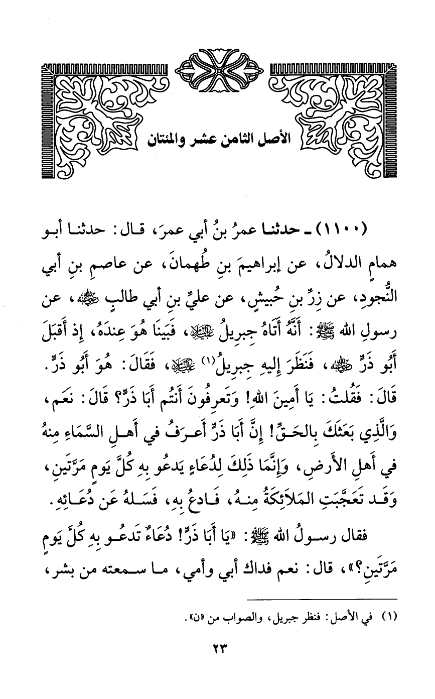 1100 - حدثنا عمر بن أبي عمر، قال: حدثنا أبو همامٍ الدلال، عن إبراهيم بن طهمان، عن عاصم بن أبي النجود، عن زر بن حبيشٍ، عن علي بن أبي طالبٍ رضي الله عنه، عن رسول الله صلى الله عليه وسلم: أنه أتاه جبريل عليه السلام، فبينا هو عنده، إذ أقبل أبو ذرٍّ رضي الله عنه، فنظر إليه جبريل عليه السلام، فقال: هو أبو ذرٍّ. قال: فقلت: يا أمين الله! وتعرفون أنتم أبا ذرٍّ؟ قال: نعم، والذي بعثك بالحق! إن أبا ذرٍّ أعرف في أهل السماء منه في أهل الأرض، وإنما ذلك لدعاءٍ يدعو به كل يومٍ مرتين، وقد تعجبت الملائكة منه، فادع به، فسله عن دعائه.