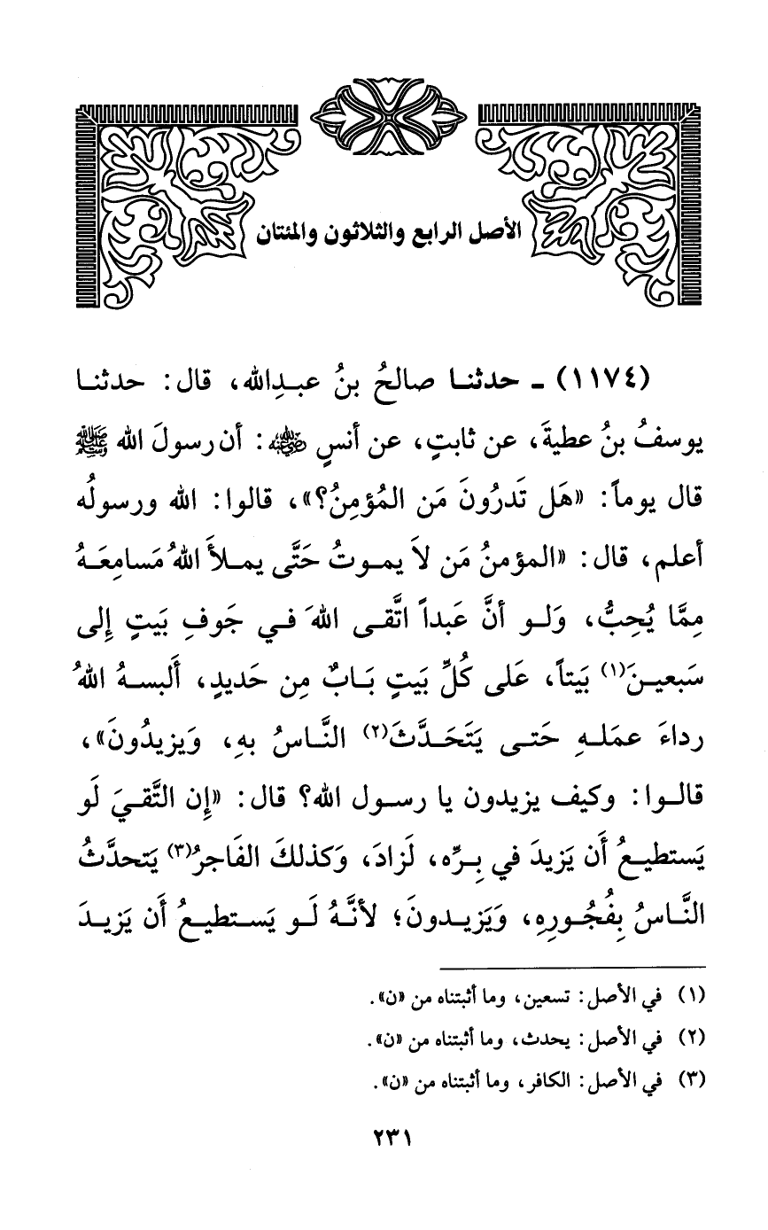 1174 - حدثنا صالح بن عبد الله، قال: حدثنا يوسف بن عطية، عن ثابتٍ، عن أنسٍ رضي الله عنه: أن رسول الله صلى الله عليه وسلم قال يوماً: ((هل تدرون من المؤمن؟))، قالوا: الله ورسوله أعلم، قال: ((المؤمن من لا يموت حتى يملأ الله مسامعه مما يحب، ولو أن عبداً اتقى الله في جوف بيتٍ إلى سبعين بيتاً، على كل بيتٍ بابٌ من حديدٍ، ألبسه الله رداء عمله حتى يتحدث الناس به، ويزيدون))، قالوا: وكيف يزيدون يا رسول الله؟ قال: ((إن التقي لو يستطيع أن يزيد في بره، لزاد، وكذلك الفاجر يتحدث الناس بفجوره، ويزيدون؛ لأنه لو يستطيع أن يزيد