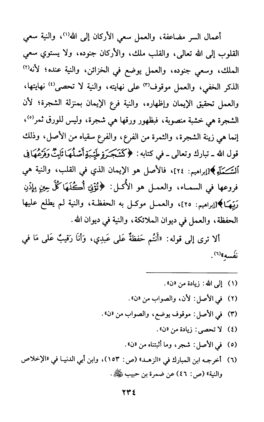 أعمال السر مضاعفة، والعمل سعي الأركان إلى الله، والنية سعي القلوب إلى الله تعالى، والقلب ملك، والأركان جنوده، ولا يستوي سعي الملك، وسعي جنوده، والعلم يوضع في الخزائن، والنية عنده؛ لأنه الذكر الخفي، والعمل موقوف على نهايته، والنية لا تحصى نهايتها، والعمل تحقيق الإيمان وإظهاره، والنية فرع الإيمان بمنزلة الشجرة؛ لأن الشجرة هي خشبة منصوبة، فبظهور ورقها هي شجرة، وليس للورق ثمر، إنما هي زينة الشجرة، والثمرة من الفرع، والفرع سقياه من الأصل، وذلك قول الله -تبارك وتعالى- في كتابه: {كشجرةٍ طيبةٍ أصلها ثابتٌ وفرعها في السماء}، فالأصل هو الإيمان الذي في القلب، والنية هي فروعها في السماء، والعمل هو الأكل: {تؤتي أكلها كل حينٍ بإذن ربها}، والعمل موكل به الحفظة، والنية لم يطلع عليها الحفظة، والعمل في ديوان الملائكة، والنية في ديوان الله.