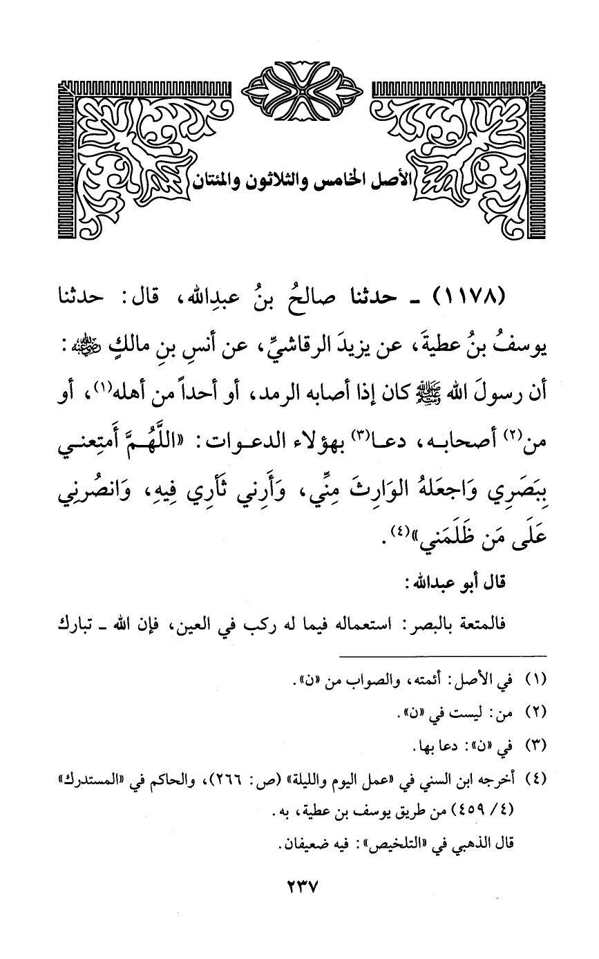 1178 - حدثنا صالح بن عبد الله، قال: حدثنا يوسف بن عطية، عن يزيد الرقاشي، عن أنس بن مالكٍ رضي الله عنه: أن رسول الله صلى الله عليه وسلم كان إذا أصابه الرمد، أو أحداً من أهله، أو من أصحابه، دعا بهؤلاء الدعوات: ((اللهم أمتعني ببصري، واجعله الوارث مني، وأرني ثأري فيه، وانصرني على من ظلمني)).