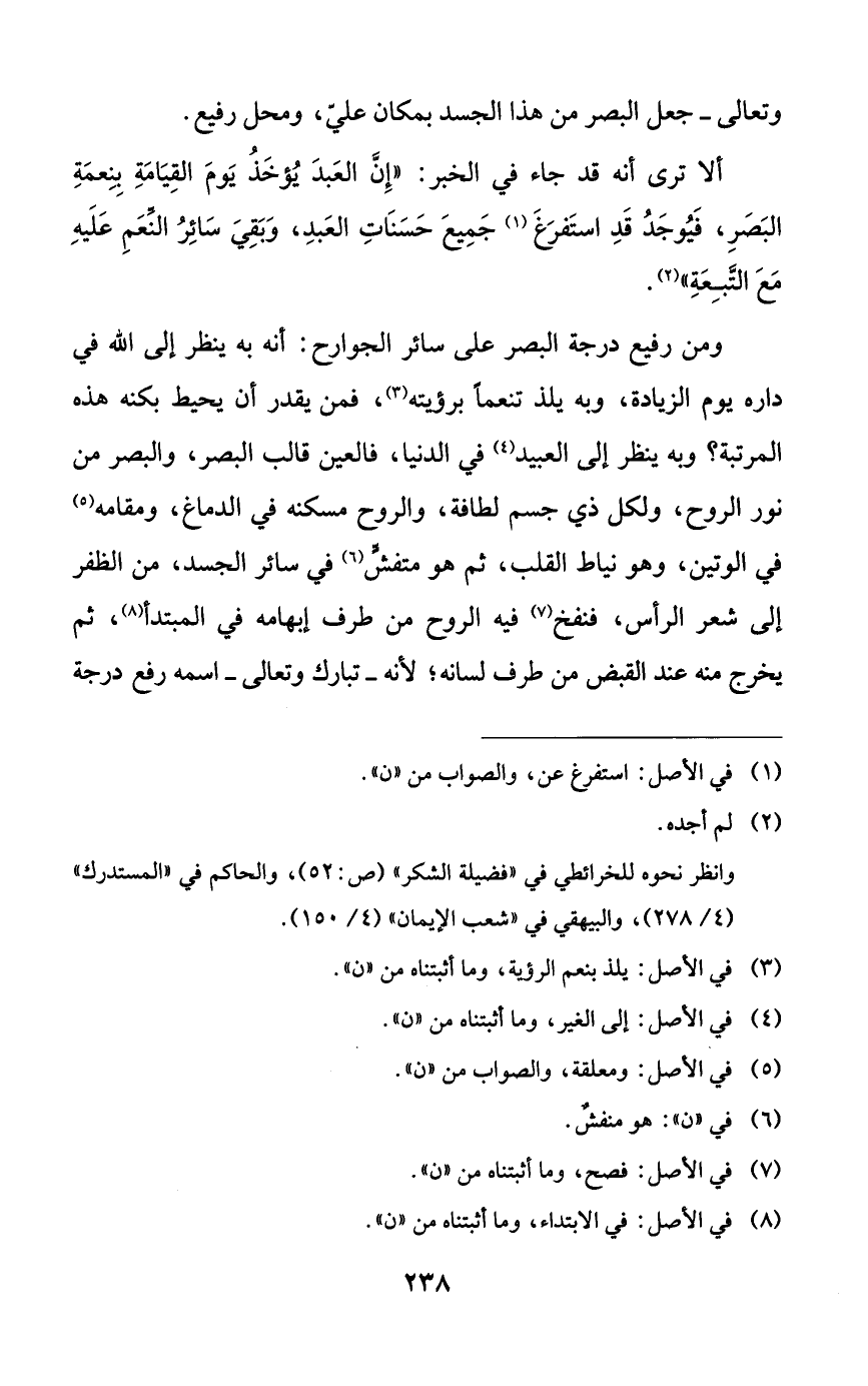 ومن رفيع درجة البصر على سائر الجوارح: أنه به ينظر إلى الله في داره يوم الزيادة، وبه يلذ تنعماً برؤيته، فمن يقدر أن يحيط بكنه هذه المرتبة؟ وبه ينظر إلى العبيد في الدنيا، فالعين قالب البصر، والبصر من نور الروح، ولكل ذي جسم لطافة، والروح مسكنه في الدماغ، ومقامه في الوتين، وهو نياط القلب، ثم هو متفشٍّ في سائر الجسد، من الظفر إلى شعر الرأس، فنفخ فيه الروح من طرف إبهامه في المبتدأ، ثم يخرج منه عند القبض من طرف لسانه؛ لأنه -تبارك وتعالى- اسمه رفع درجة