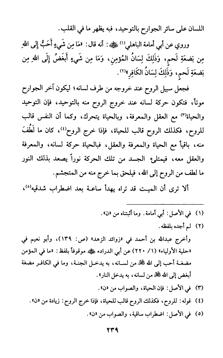 فجعل سبيل الروح عند خروجه من طرف لسانه؛ ليكون آخر الجوارح موتاً، فتكون حركة لسانه عند خروج الروح منه بالتوحيد، فإن التوحيد والحياة مع العقل والمعرفة، وبالحياة يتحرك، وكما أن النفس قالب للروح، فكذلك الروح قالب للحياة، فإذا خرج الروح، كان ما لطف منه، باقياً مع الحياة والمعرفة والعقل، فبالحياة حركة لسانه، والمعرفة والعقل معه، فيمتلئ الجسد من تلك الحركة نوراً يصعد بذلك النور ما لطف من الروح إلى الله، فيلحق بما خرج منه من المتجشم.