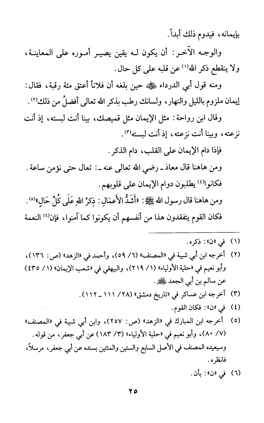 ومنه قول أبي الدرداء رضي الله عنه حين بلغه أن فلاناً أعتق مئة رقبة، فقال: إيمان ملزوم بالليل والنهار، ولسانك رطب بذكر الله تعالى أفضل من ذلك.