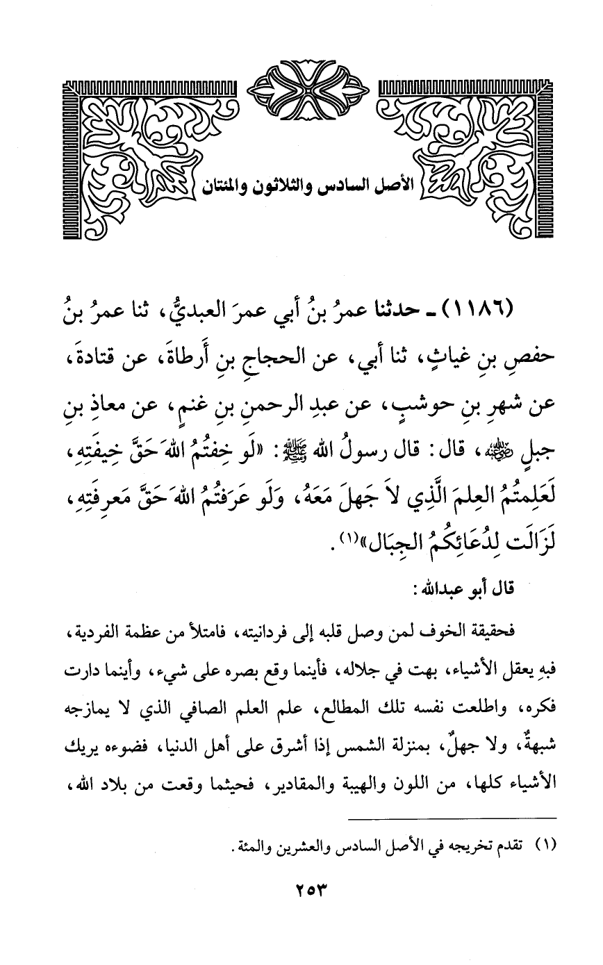 1186 - حدثنا عمر بن أبي عمر العبدي، ثنا عمر بن حفص بن غياثٍ، ثنا أبي، عن الحجاج بن أرطأة، عن قتادة، عن شهر بن حوشبٍ، عن عبد الرحمن بن غنمٍ، عن معاذ بن جبلٍ رضي الله عنه، قال: قال رسول الله صلى الله عليه وسلم: ((لو خفتم الله حق خيفته، لعلمتم العلم الذي لا جهل معه، ولو عرفتم الله حق معرفته لزالت لدعائكم الجبال)).