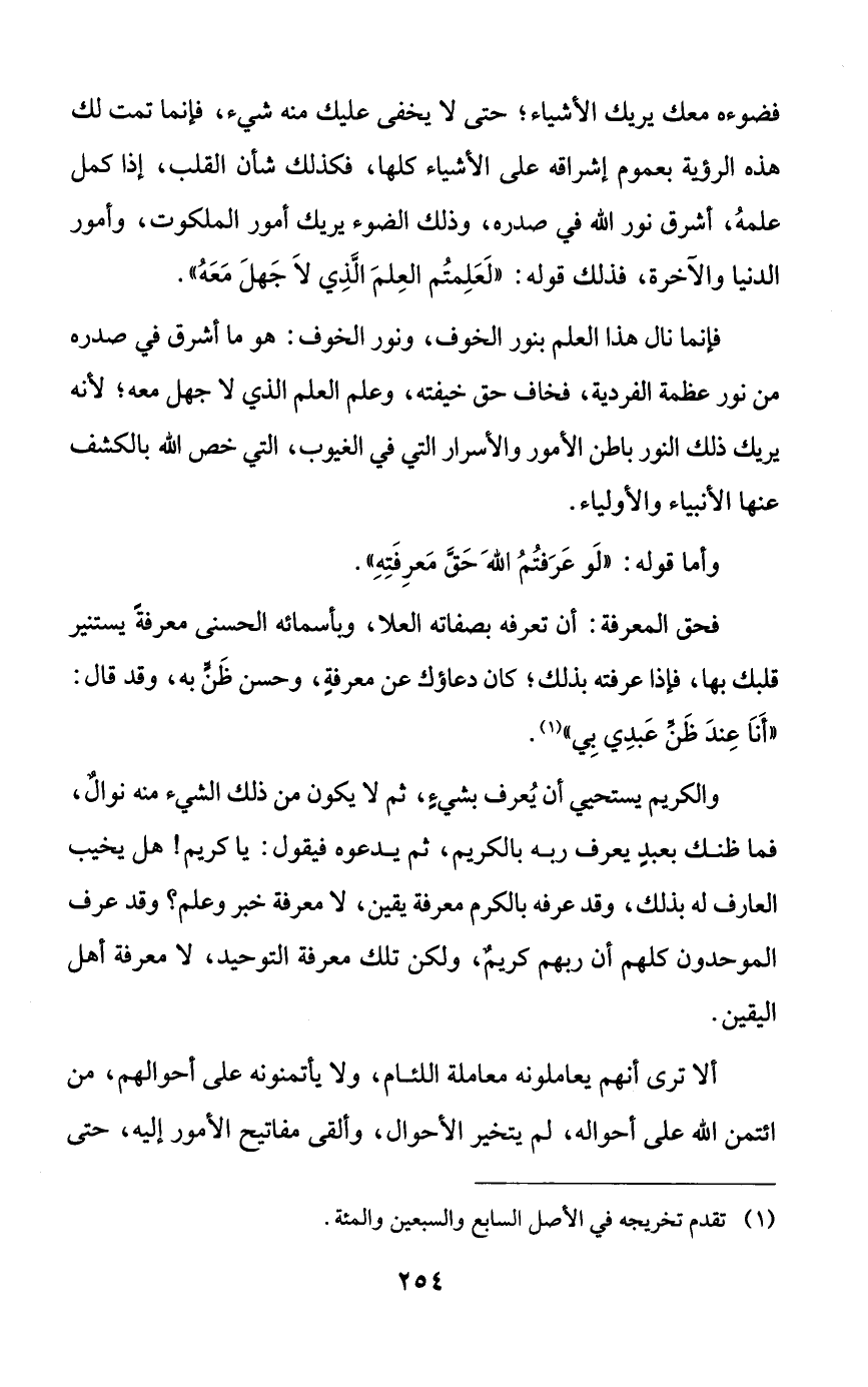 فضوءه، معك يريك الأشياء؛ حتى لا يخفى عليك منه شيء، فإنما تمت لك هذه الرؤية بعموم إشراقه على الأشياء كلها، فكذلك شأن القلب، إذا كمل علمه، أشرق نور الله في صدره، وذلك الضوء يريك أمور الملكوت، وأمور الدنيا والآخرة، فذلك قوله: ((لعلمتم العلم الذي لا جهل معه)).