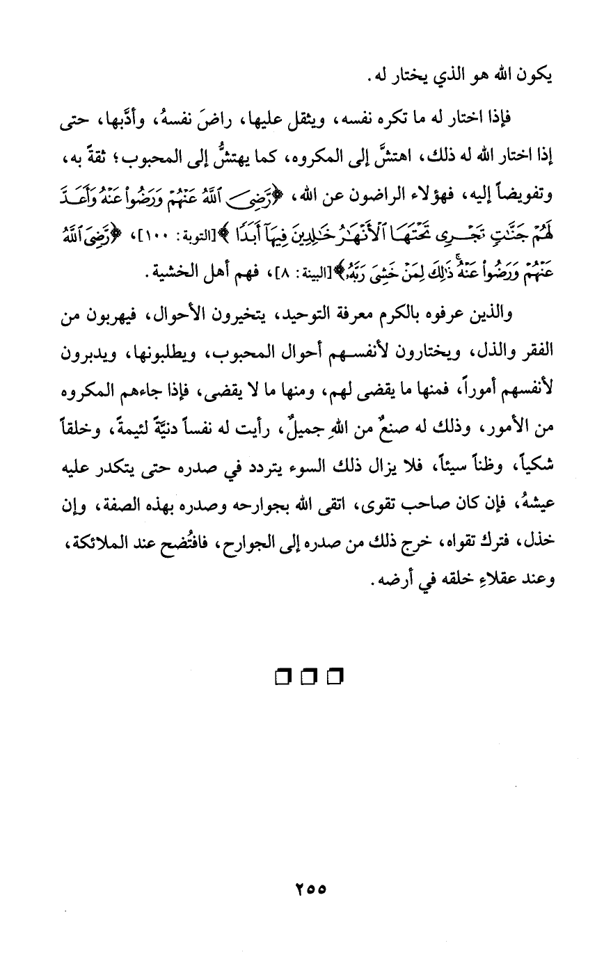 فإذا اختار له ما تكره نفسه، ويثقل عليها، راض نفسه، وأدبها، حتى إذا اختار الله له ذلك، اهتش إلى المكروه، كما يهتش إلى المحبوب؛ ثقةً به، وتفويضاً إليه، فهؤلاء الراضون عن الله، {رضي الله عنهم ورضوا عنه وأعد لهم جناتٍ تجري تحتها الأنهر خالدين فيها أبداً}، {رضي الله عنهم ورضوا عنه ذلك لمن خشي ربه}، فهم أهل الخشية.