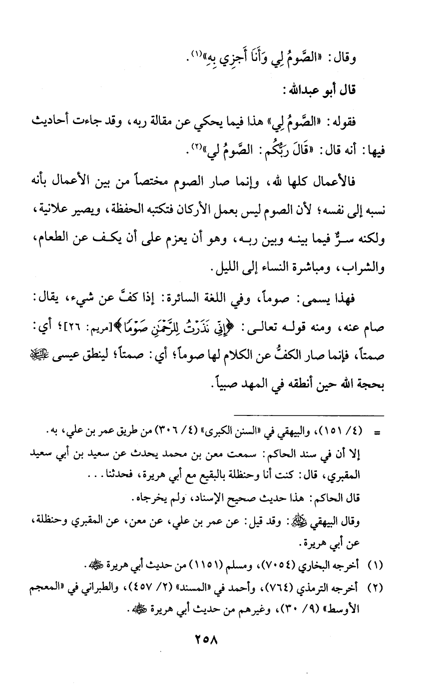 فهذا يسمى: صوماً، وفي اللغة السائرة: إذا كف عن شيء، يقال: صام عنه، ومنه قوله تعالى: {إني نذرت للرحمن صوماً}؛ أي: صمتاً، فإنما صار الكف عن الكلام لها صوماً؛ أي: صمتاً؛ لينطق عيسى عليه السلام بحجة الله حين أنطقه في المهد صبياً.