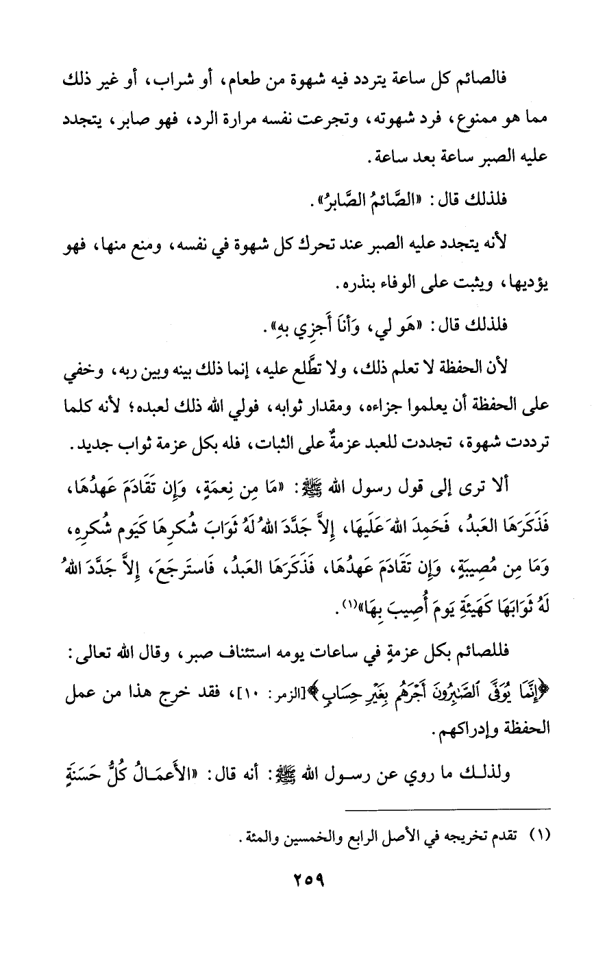 فللصائم بكل عزمةٍ في ساعات يومه استئناف صبر، وقال الله تعالى: {إنما يوفى الصابرون أجرهم بغير حسابٍ}، فقد خرج هذا من عمل الحفظة وإدراكهم.