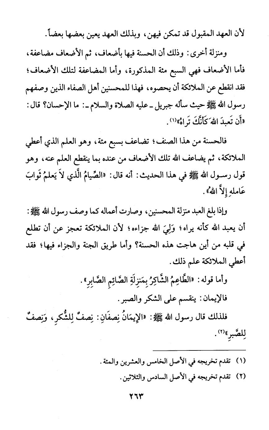ومنزلة أخرى: وذلك أن الحسنة فيها بأضعاف، ثم الأضعاف مضاعفة، فأما الأضعاف فهي السبع مئة المذكورة، وأما المضاعفة لتلك الأضعاف؛ فقد انقطع عن الملائكة أن يحصوه، فهذا للمحسنين أهل الصفاء الذين وصفهم رسول الله صلى الله عليه وسلم حيث سأله جبريل –عليه الصلاة والسلام-: ما الإحسان؟ قال: ((أن تعبد الله كأنك تراه)).