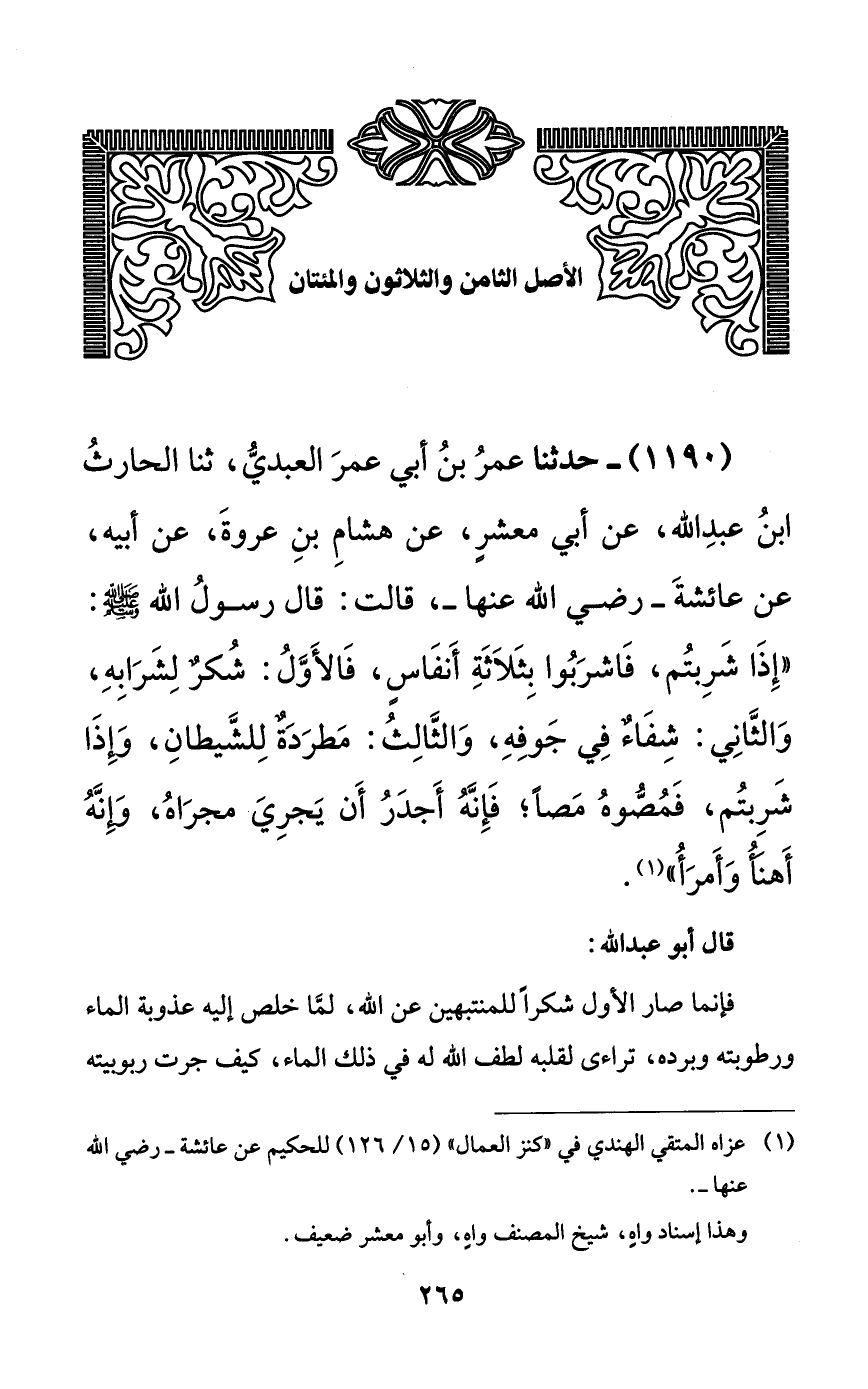 1190 - حدثنا عمر بن أبي عمر العبدي، ثنا الحارث ابن عبد الله، عن أبي معشرٍ، عن هشام بن عروة، عن أبيه، عن عائشة -رضي الله عنها-، قالت: قال رسول الله صلى الله عليه وسلم: ((إذا شربتم، فاشربوا بثلاثة أنفاسٍ، فالأول: شكرٌ لشرابه، والثاني: شفاءٌ في جوفه، والثالث: مطردةٌ للشيطان، وإذا شربتم، فمصوه مصاً؛ فإنه أجدر أن يجري مجراه، وإنه أهنأ وأمرأ)).