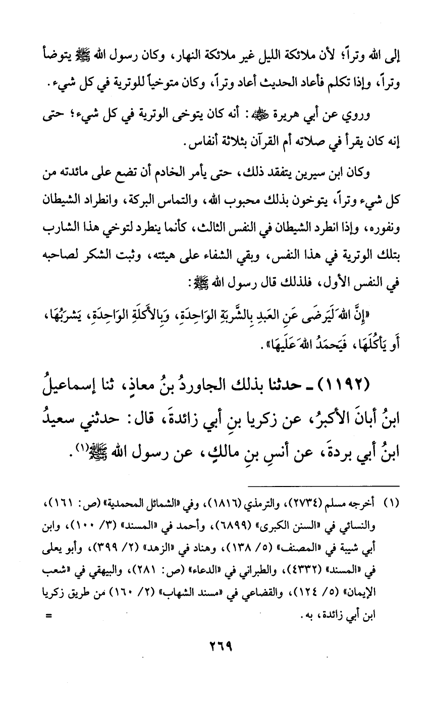إلى الله وتراً؛ لأن ملائكة الليل غير ملائكة النهار، وكان رسول الله صلى الله عليه وسلم يتوضأ وتراً، وإذا تكلم فأعاد الحديث أعاد وتراً، وكان متوخياً للوترية في كل شيء.