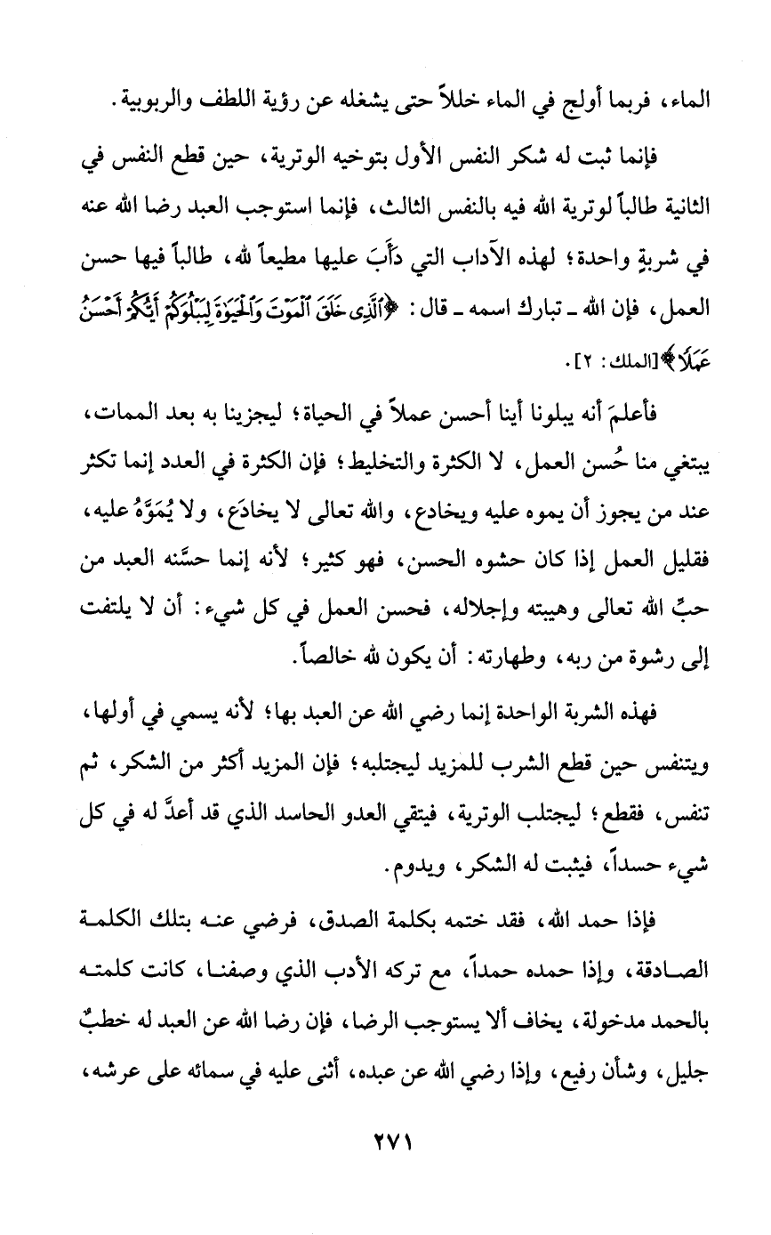 فإنما ثبت له شكر النفس الأول بتوخيه الوترية، حين قطع النفس في الثانية طالباً لوترية الله فيه بالنفس الثالث، فإنما استوجب العبد رضا الله عنه في شربةٍ واحدة، لهذه الآداب التي دأب عليها مطيعاً لله، طالباً فيها حسن العمل، فإن الله -تبارك اسمه- قال: {الذي خلق الموت والحياة ليبلوكم أيكم أحسن عملاً}.