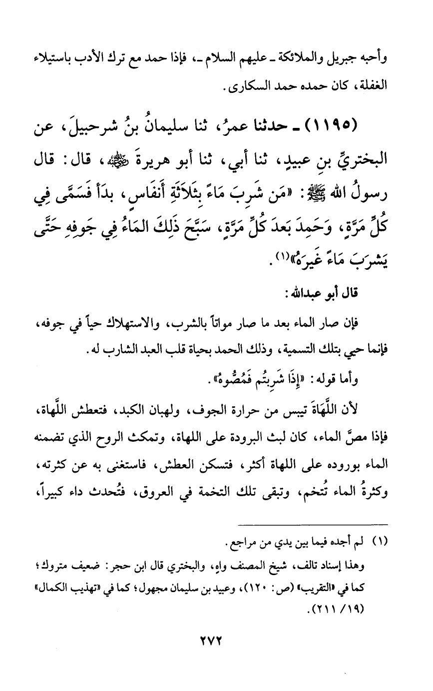 1195 - حدثنا عمر، ثنا سليمان بن شرحبيل، عن البختري بن عبيدٍ، ثنا أبي، ثنا أبو هريرة رضي الله عنه، قال: قال رسول الله صلى الله عليه وسلم: ((من شرب ماءً بثلاثة أنفاسٍ، بدأ فسمى في كل مرةٍ، وحمد بعد كل مرةٍ، سبح ذلك الماء في جوفه حتى يشرب ماءً غيره)).