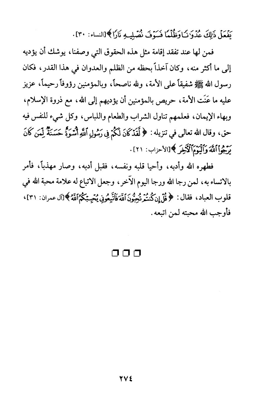فمن لها عند تفقد إقامة مثل هذه الحقوق التي وصفنا، يوشك أن يؤديه إلى ما أكثر منه، وكان آخذاً بحظه من الظلم والعدوان في هذا القدر، فكان رسول الله صلى الله عليه وسلم شفيقاً على الأمة، ولله ناصحاً، وبالمؤمنين رؤوفاً رحيماً، عزيز عليه ما عنت الأمة، حريص بالمؤمنين أن يؤديهم إلى الله، مع ذروة الإسلام، وبهاء الإيمان، فعلمهم تناول الشراب والطعام واللباس، وكل شيء للنفس فيه حق، وقال الله تعالى في تنزيله: {لقد كان لكم في رسول الله أسوةٌ حسنةٌ لمن كان يرجوا الله واليوم الآخر}.