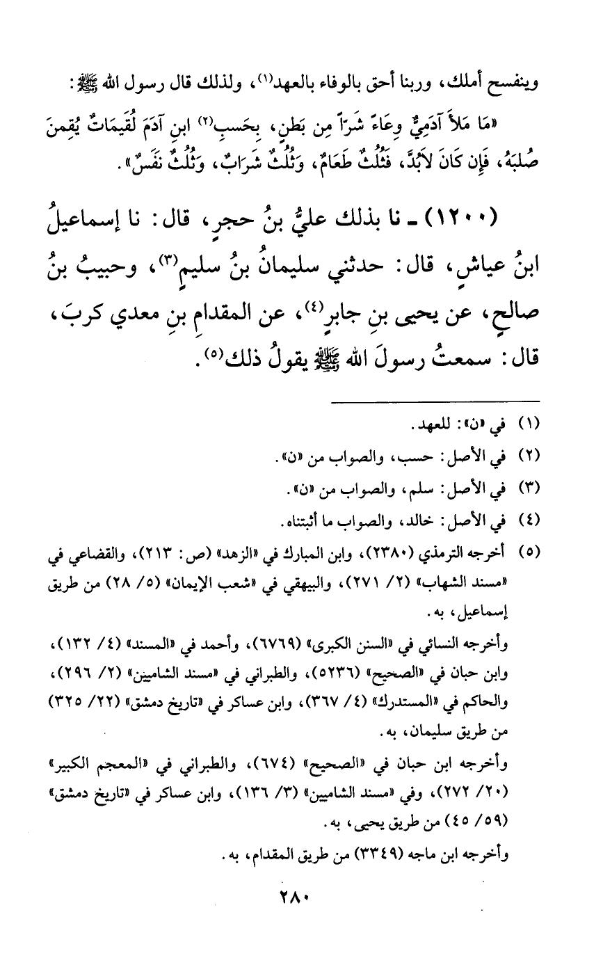 1200 - نا بذلك علي بن حجرٍ، قال: نا إسماعيل ابن عياشٍ، قال: حدثني سليمان بن سليمٍ، وحبيب بن صالحٍ، عن يحيى بن جابرٍ، عن المقدام بن معدي كرب، قال: سمعت رسول الله صلى الله عليه وسلم يقول ذلك.